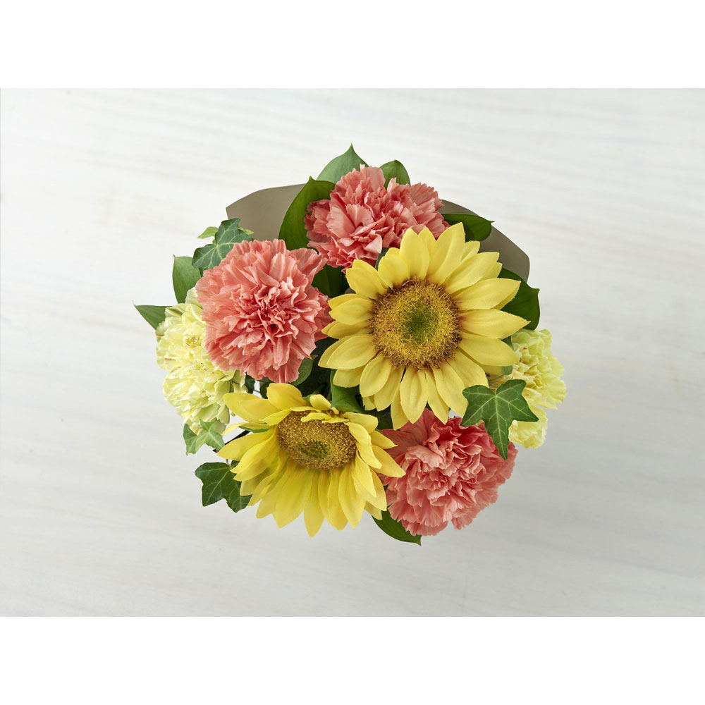 「敬慕」「憧れ」という、お父さまへの尊敬の想いに重なる花言葉を持つひまわり。その明るく力強い姿は、見ているだけで心に元気を運んでくれます。そんなひまわりを、<日比谷花壇>のデザイナー・西澤真実子さんが、特別な想いを込めてアレンジメントしました。洗練された仕上がりは、飾るだけでお部屋の雰囲気をパッと明るく塗り替え、爽やかな初夏の風を運んできてくれます。一緒にお届けするのは、文明堂東京の父の日限定カステラ。蜂蜜がふんわり香る伝統の「ハニーカステラ」に、「お父さんありがとう」のメッセージをのせました。手間のいらない優しさと、心に染み入る甘さが、お父さまの日常をパッと温かく彩ります。日頃の「ありがとうございます」の気持ちを、ひまわりの瑞々しい輝きと、伝統の味わいに託して。器に入ったアレンジメントスタイルですので、お父さまの手を煩わせることなく、届いてすぐに愉しんでいただけます。