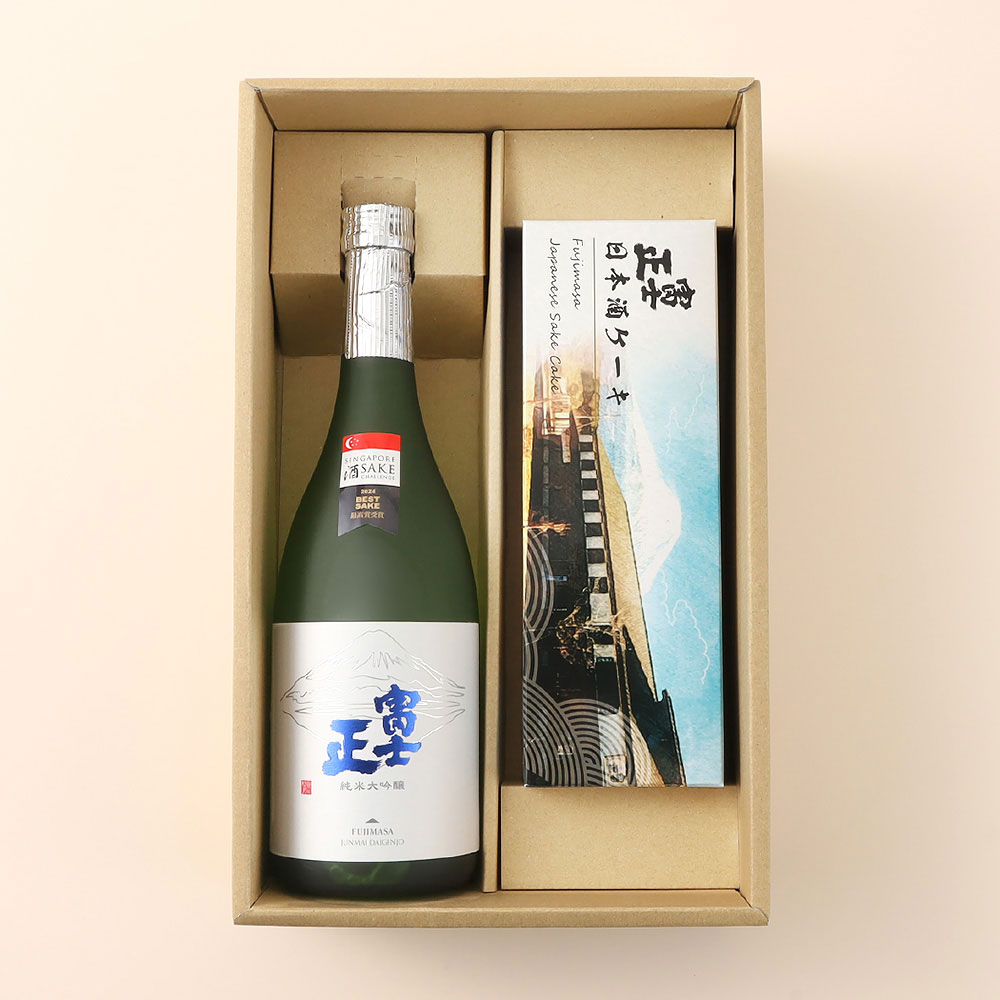 富士山麓の静かな時間が育てた、富士正の純米大吟醸と、日本酒ケーキを組み合わせた特別なセットです。酒蔵の技と想いを、そのまま味わいと甘味に映した、富士正ならではの贅沢な取り合わせ。ご自宅用にも、大切な方への贈りものにもふさわしい一品です。純米大吟醸は、厳選された酒米と富士山麓の清らかな水で丁寧に仕込みました。香りは華やかでありながら上品。口に含むと、きめ細やかな旨みが広がり、雑味のない澄んだ余韻が静かに続きます。富士正の酒造りの集大成ともいえる、気品ある味わいです。セットの日本酒ケーキは、この富士正の日本酒を贅沢に使い、しっとりと焼き上げました。ふんわりと立ちのぼる酒の香りと、やさしい甘さが重なり、後味はすっきり。約3%程度のアルコールを含み、大人のための上質な菓子に仕上がっています。日本酒を飲みながら、日本酒を使ったケーキを味わう、蔵元ならではの楽しみ方です。純米大吟醸は冷やして香りを楽しむのがおすすめ。日本酒ケーキは少し常温に戻すことで、香りと口どけがより豊かになります。食後のひとときや、特別な日の締めくくりに最適です。日本酒を愛する方はもちろん、甘いものがお好きな方にも喜ばれる組み合わせ。富士山麓で生まれた、酒と菓子の上質な調和を、ぜひご堪能ください。