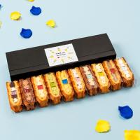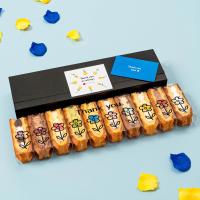 父の日のメッセージカードと「Thank you」のシートが付いたワッフルケーキ10個セット。オリジナルのカスタードクリームをサンドした「プレーン」、柑橘の香り広がる「オレンジ」、さっぱりとした酸味の「ヨーグルト」など定番の10種を色とりどりに詰め合わせました。感謝の気持ちを表す父の日の黄色いバラをモチーフにしたシール付きでお届けいたします。
