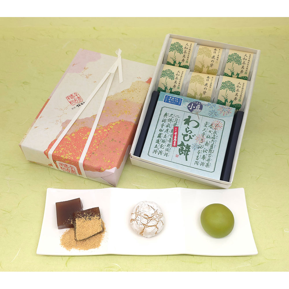 小豆わらび餅×1箱、大和茶萬壽×4個、春日 鹿の背×2個