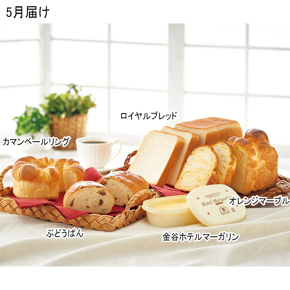 2026年5月:ロイヤルブレッド(630g×1個)、オレンジマーブル(370g×1個)、カマンベールリング(150g×1個)、ぶどうぱん(120g×1個)、金谷ホテルマーガリン(180g×1個)