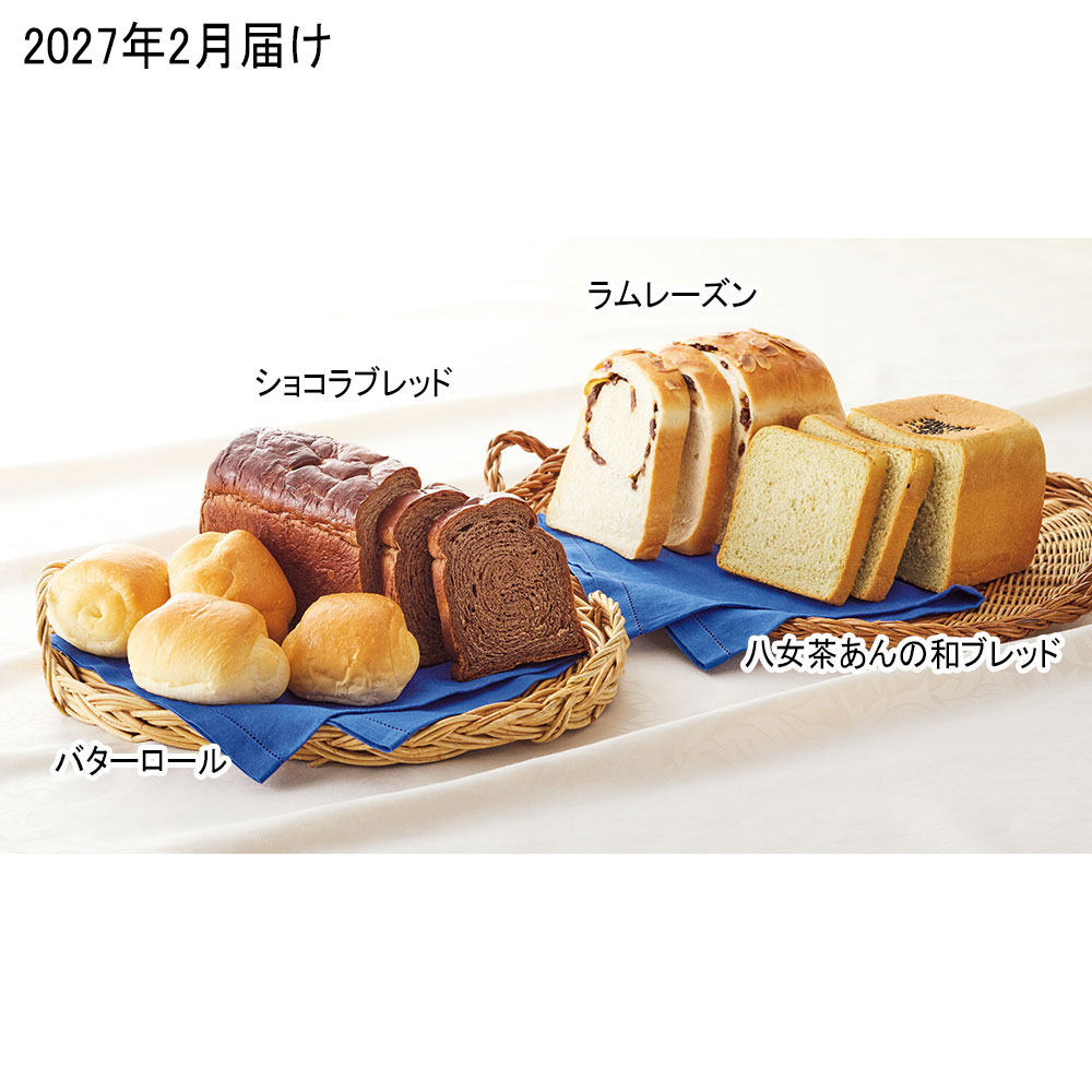 2027年2月:ショコラブレッド(400g×1個)、八女茶あんの和ブレッド(335g×1個)、ラムレーズン(400g×1個)、バターロール(30g×4個)