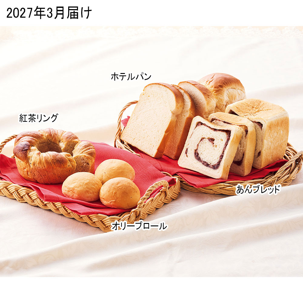 2027年3月:ホテルパン(380g×1個)、あんブレッド(390g×1個)、紅茶リング(150g×1個)、オリーブロール(30g×3個)