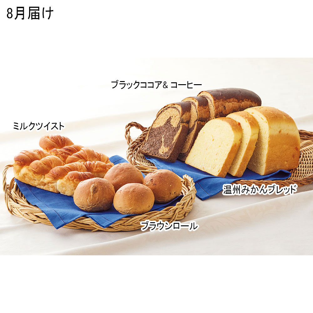 2026年8月:ブラックココア& コーヒー(360g×1個)、温州みかんブレッド(400g×1個)、ミルクツイスト(93g×2個)、ブラウンロール(30g×4個)