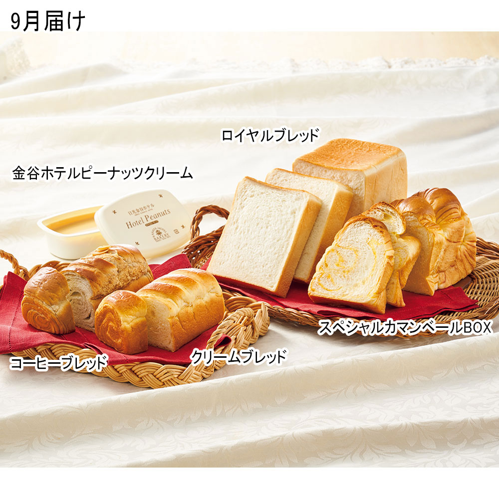 2026年9月:ロイヤルブレッド(630g×1個)、スペシャルカマンベールBOX(360g×1個)、コーヒーブレッド(110g×1個)、クリームブレッド(110g×1個)、金谷ホテルピーナッツクリーム(160g×1個)