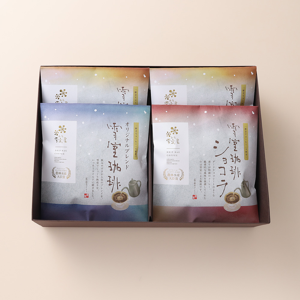 「天然雪の恩恵」雪室で寝かせた珈琲の雑味が無いまろやかな味わいを楽しめるコーヒーです。3種類の味わいを飲み比べいただけるドリップコーヒー詰め合わせギフトです。