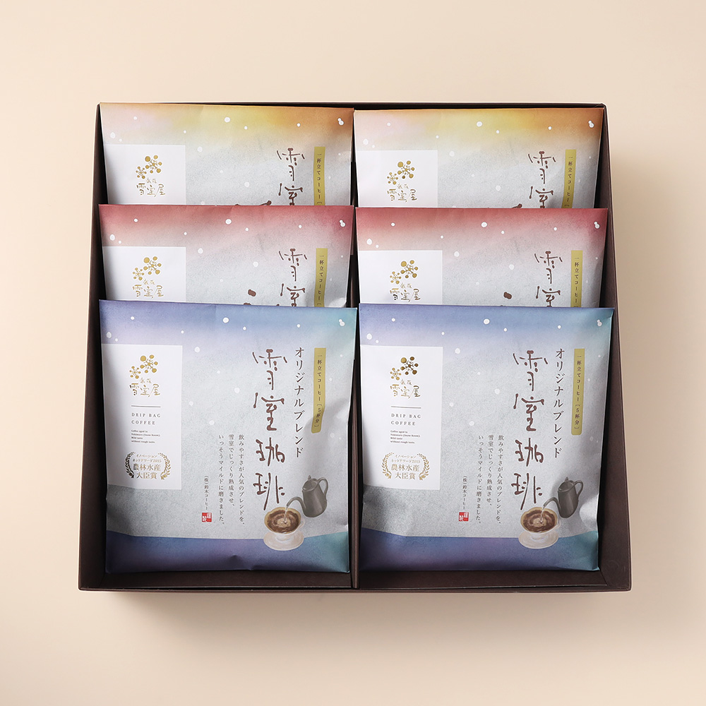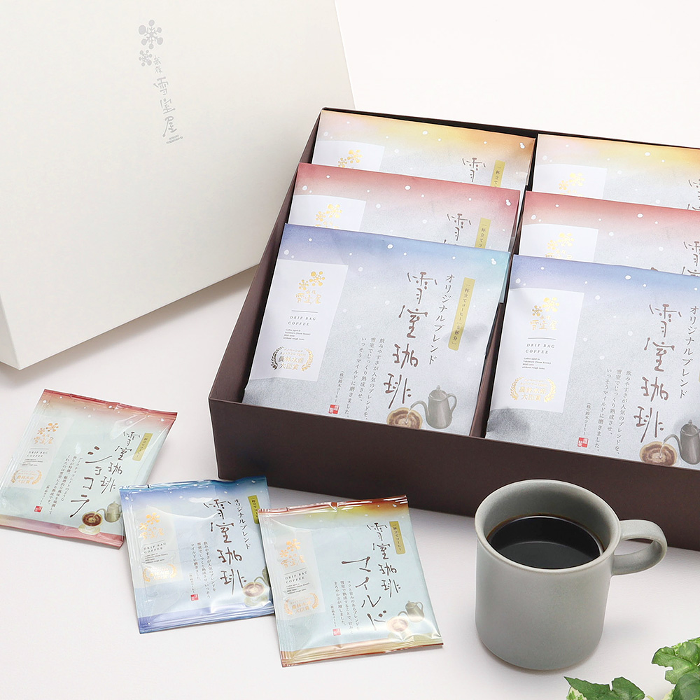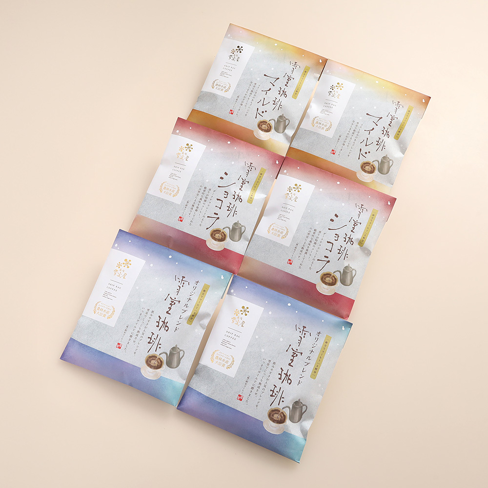 「天然雪の恩恵」雪室で寝かせた珈琲の雑味が無いまろやかな味わいを楽しめるコーヒーです。3種類の味わいを飲み比べいただけるドリップコーヒー詰め合わせギフトです。