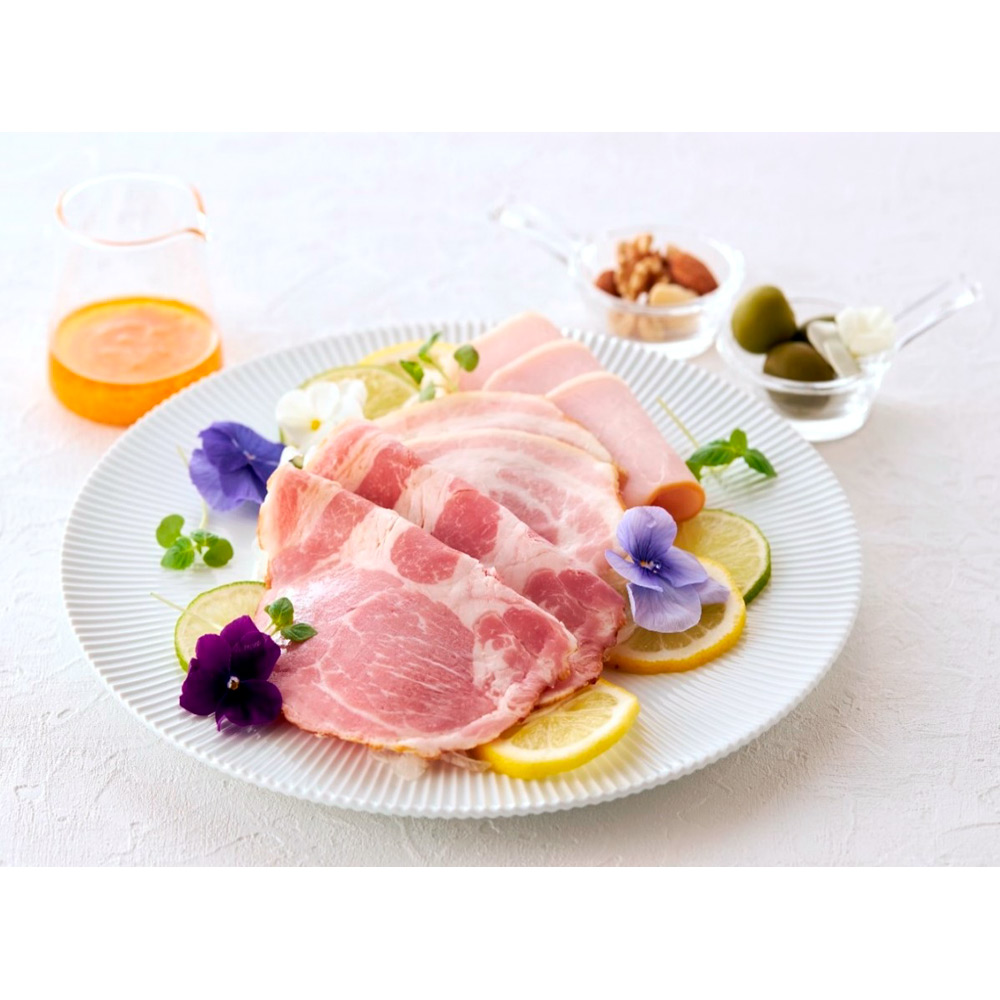 ステーキレストラン三田屋本店自慢の、桜のチップで燻製をしたロースハムハムと美味しさを引き立てるドレッシング。豚ばら肉をスモークしたベリーハム、カタロース肉を長時間漬け込んで熟成を行いスモークで仕上げたハムをセットにしました。