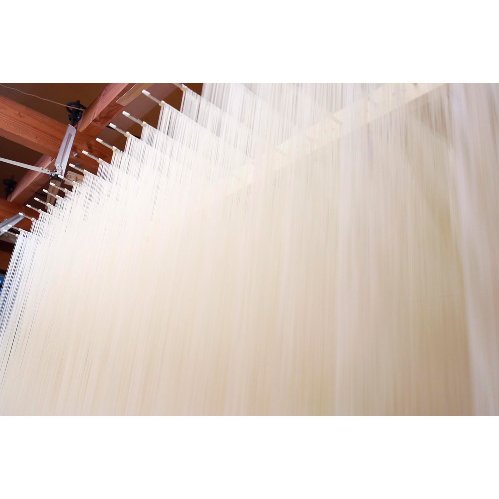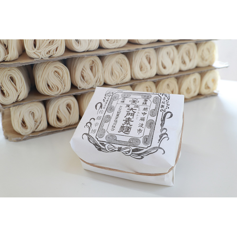 およそ180年の歴史のある大門素麺。日本髪の丸まげ状の麺が、生産者の名前入りの和紙に包まれています。雪国の厳しい寒さの中、ほとんどが手作業で作られる寒造りで、何度もよりをかけじっくり熟成させる技は、コシが強くなめらかな喉越しが特徴です。伸びにくいので、冷たくしても温かいにゅう麺にしても美味しくお召し上がりいただけます。最盛期には60人以上いた生産者が、現在は一桁となり、今や希少な手延べ麺になりました。