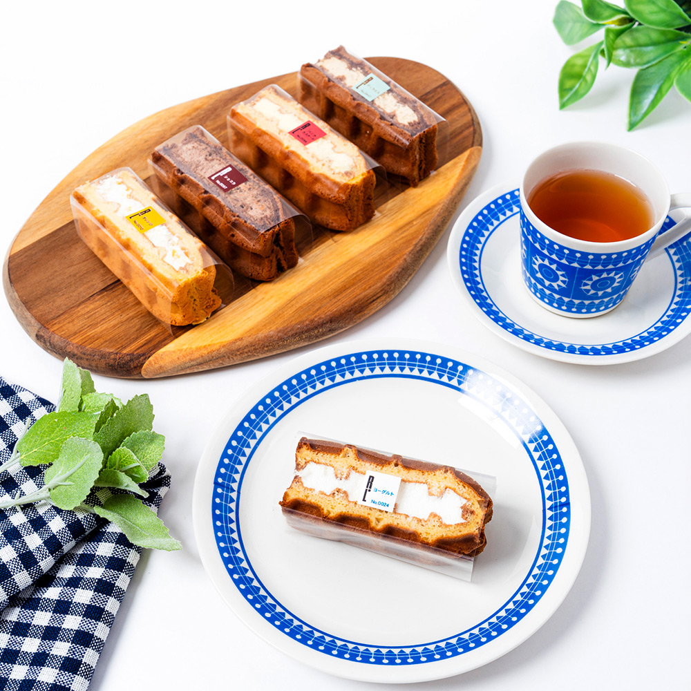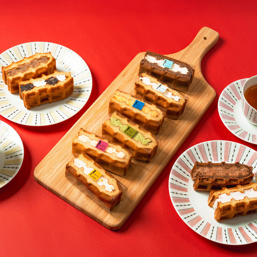 ふわふわのワッフル生地でフルーツやクリームをサンドした、<エール・エル>の人気商品。オリジナルのカスタードクリームをサンドしたプレーン、ふんわりと甘いストロベリー、上品な甘さの抹茶など創業当時から続く定番の味を中心に色とりどりの10種類を詰め合わせました。カラフルな見た目も可愛く、ギフトにもおすすめです。