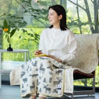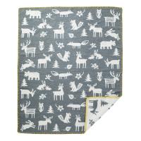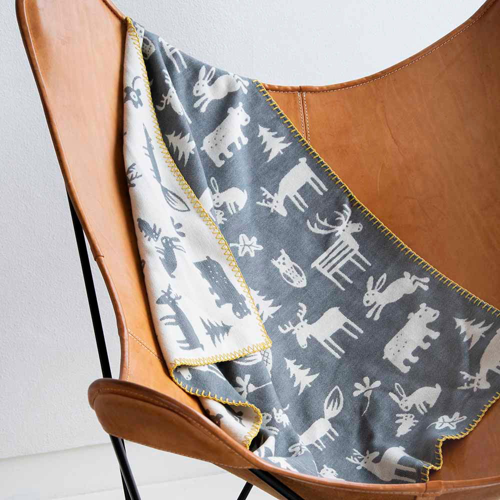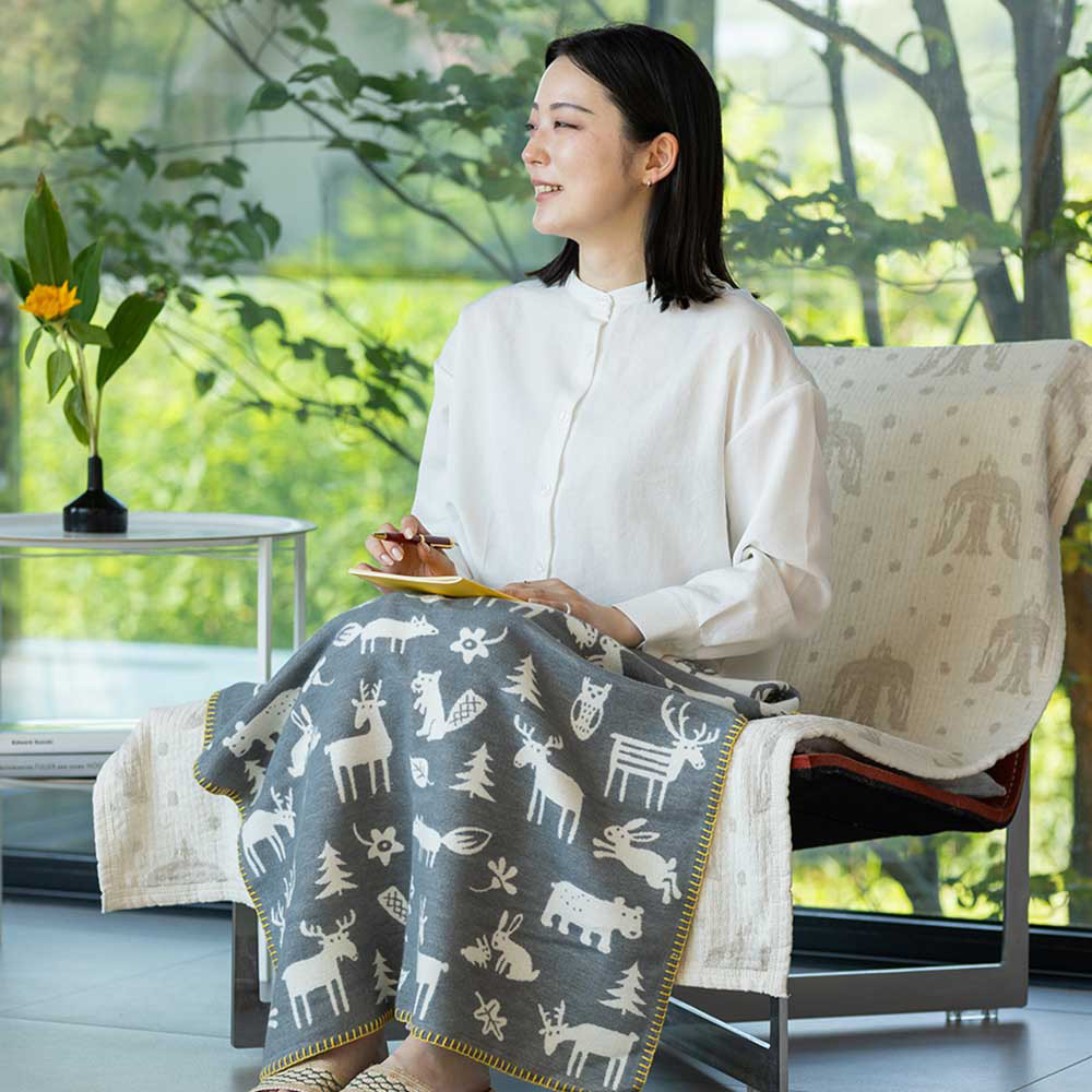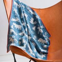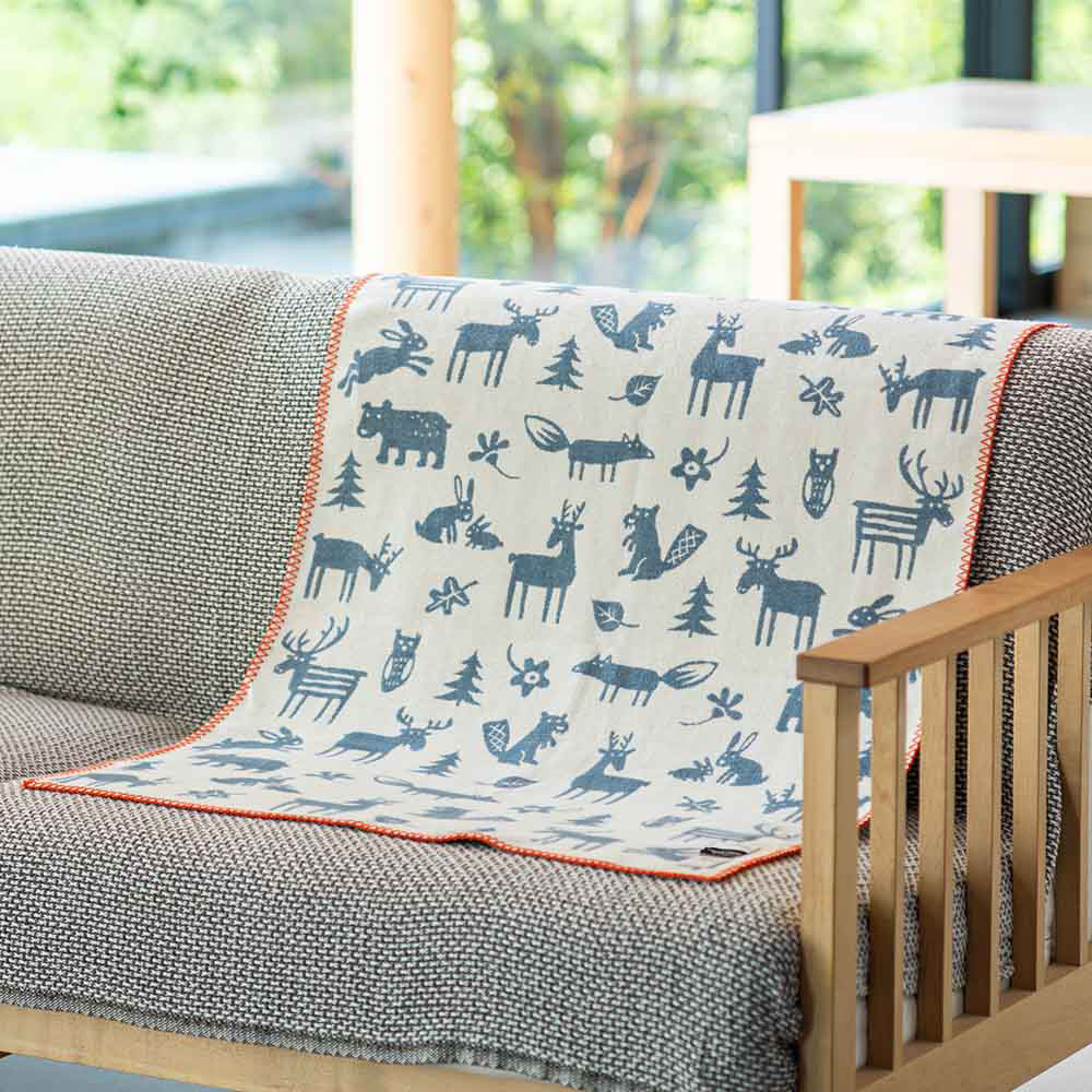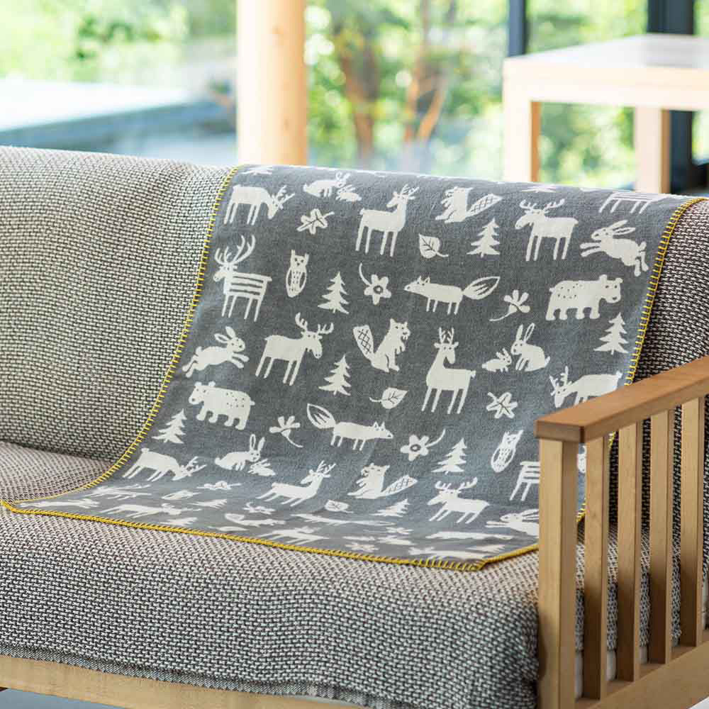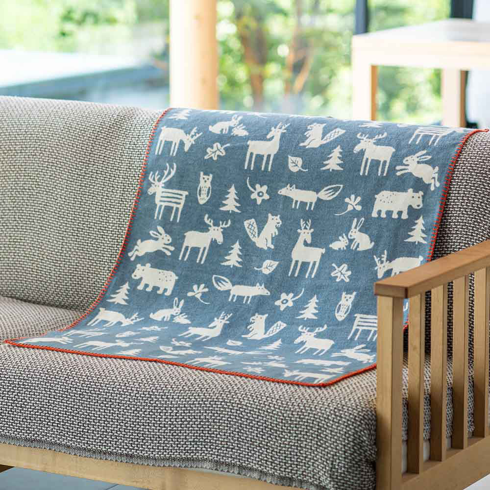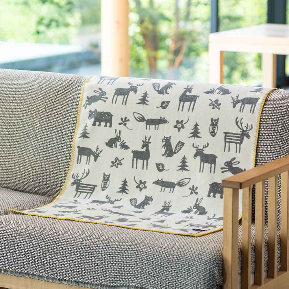 スウェーデンの森でおなじみの動物たちが大集合。お散歩バッグにもくるくるっと丸めて入れられるライトコットンブランケット。
