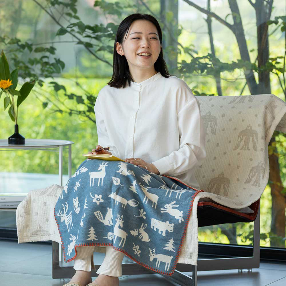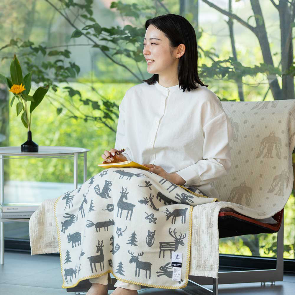 ライトコットンブランケットは、横糸、縦糸も細番手の糸を使って織り、最後にブラッシングしてフワフワに仕上げました。わずか190 グラムの軽さは、持ち運びにも便利です。デザインはスウェーデンのBengt&Lotta。素朴でユーモアに富み、生き物への愛が溢れたデザインが特徴です。