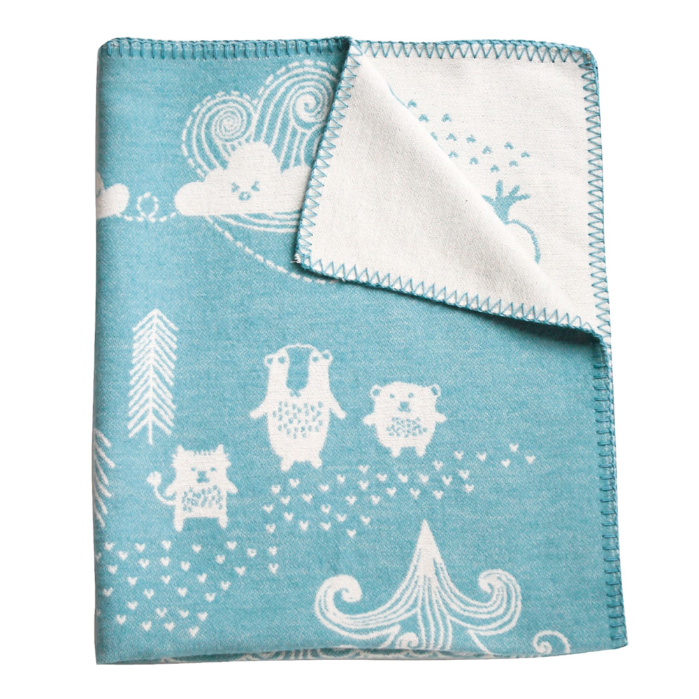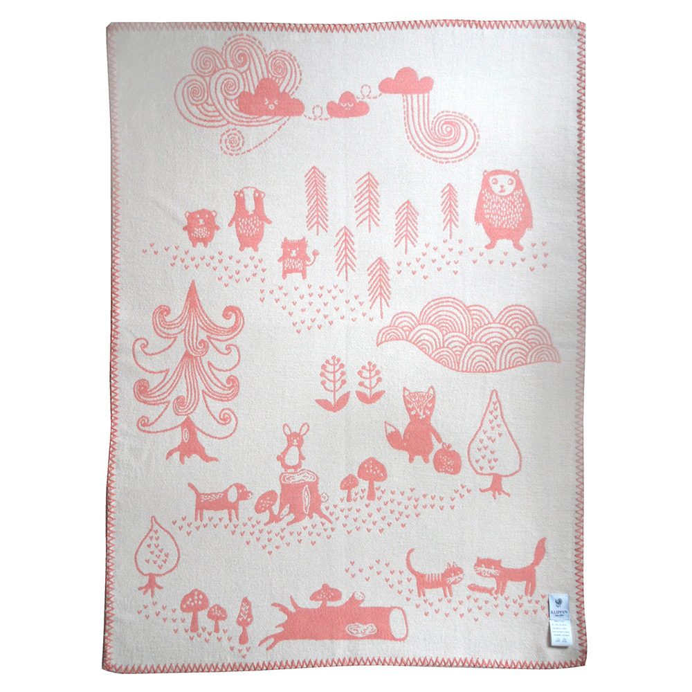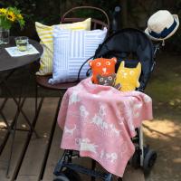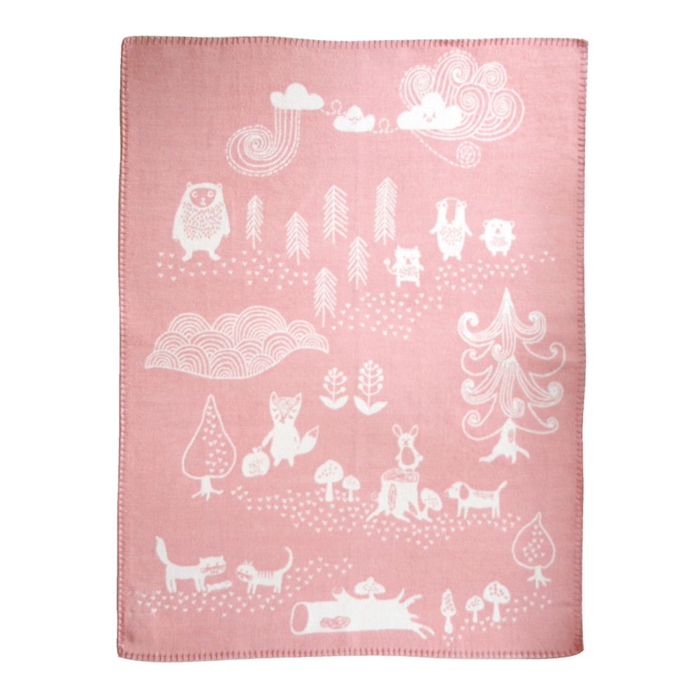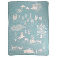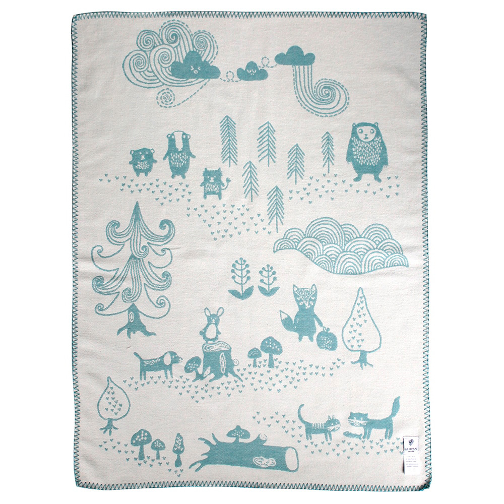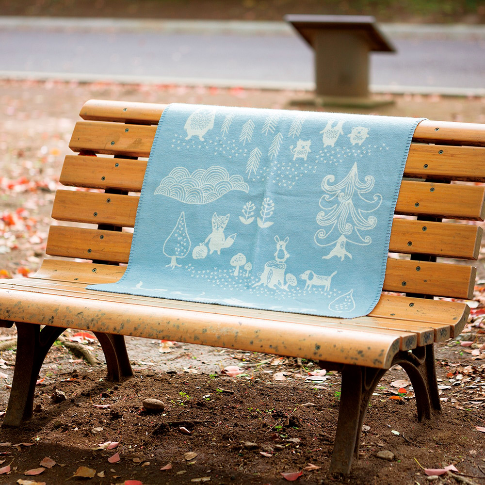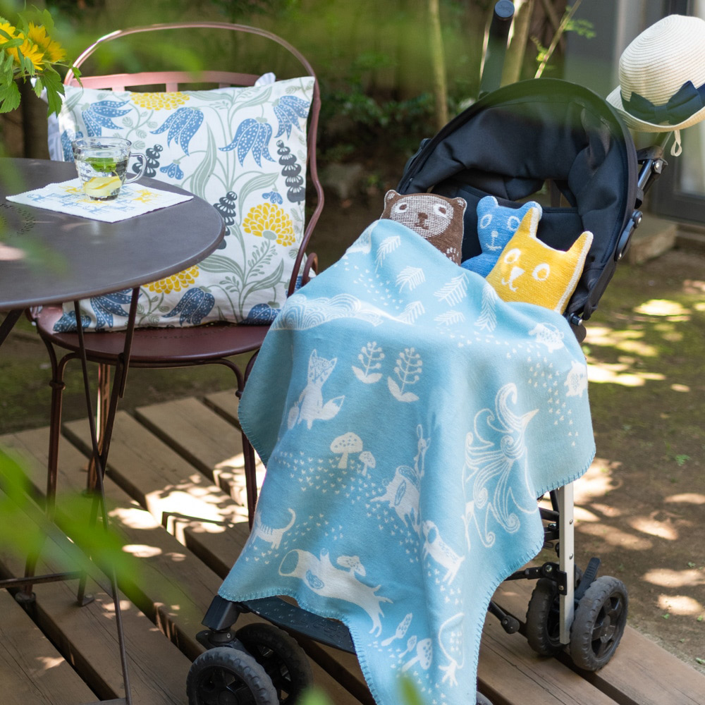 スウェーデンの森でおなじみの動物たちが大集合。お散歩バッグにもくるくるっと丸めて入れられるライトコットンブランケット。