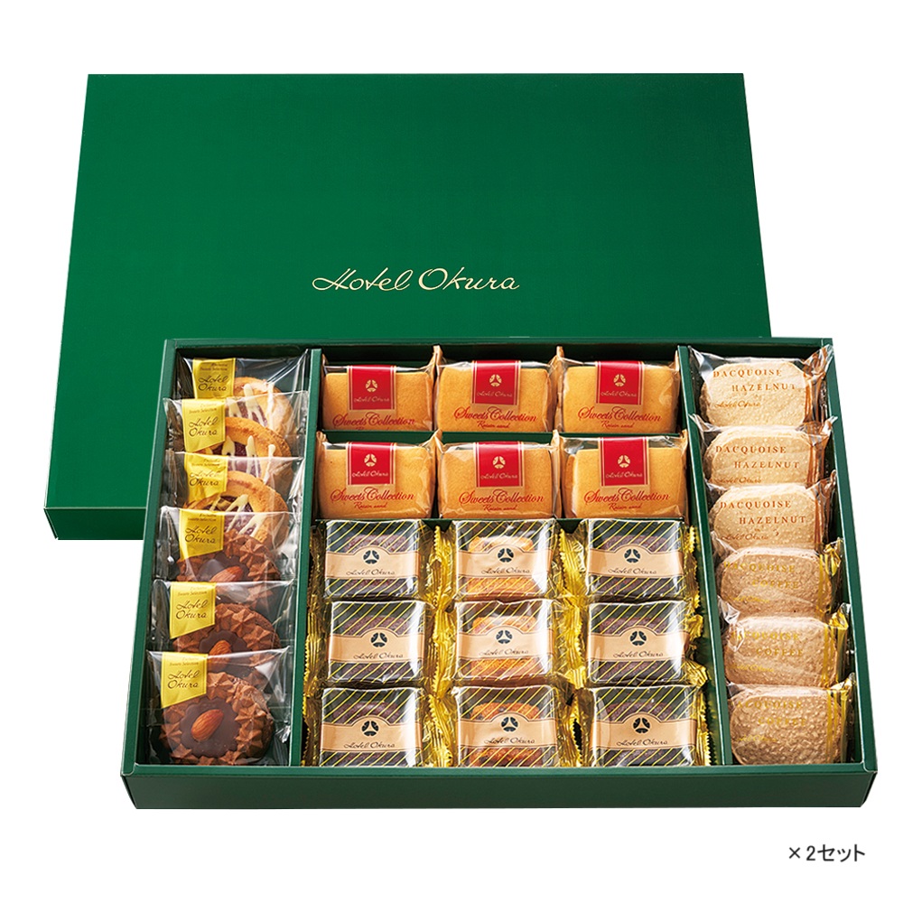 (レーズンサンド・チョコレートケーキ各6個、フルーツケーキ3個、ダックワーズ(ヘーゼルナッツ3個、コーヒー3個)、ドライケーキ(ベリーレモン3個、チョコアーモンド3個)、7種計27個)×2セット