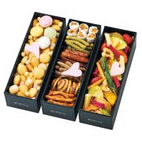 あられやボーロに野菜チップス。昔懐かしいお菓子から新しい味わいまで、色とりどりのお菓子がたくさん入った3種の詰合せです。