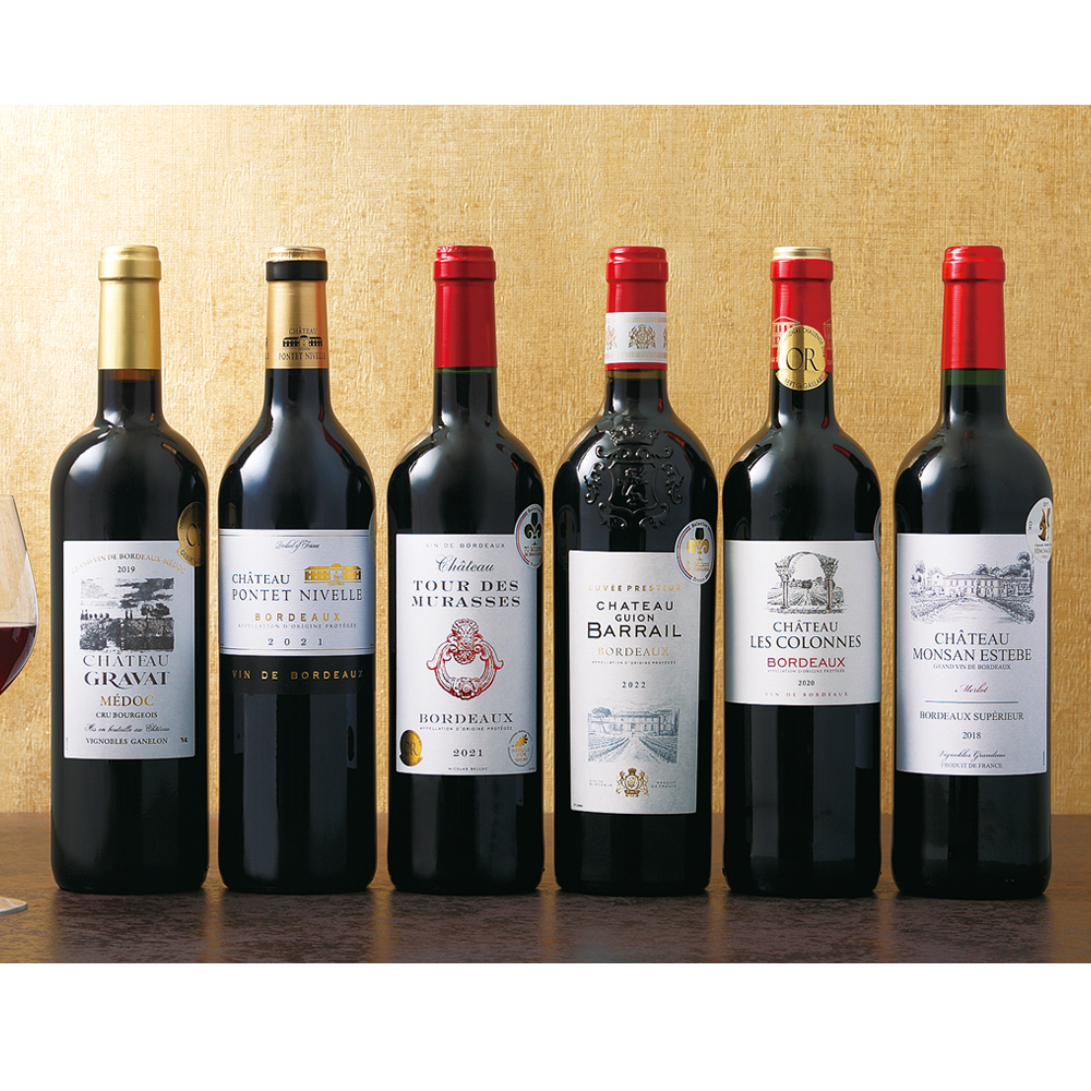 シャトーグラヴァ2019、シャトー・ポンテ・ニヴェル2021、シャトー・トゥール・デ・ミュラス2021、シャトー・ギヨン・バライ2022、シャトー・レ・コロンヌ2020、シャトー・モンサン・エステーヴ2018、各750mL×1本、計6本