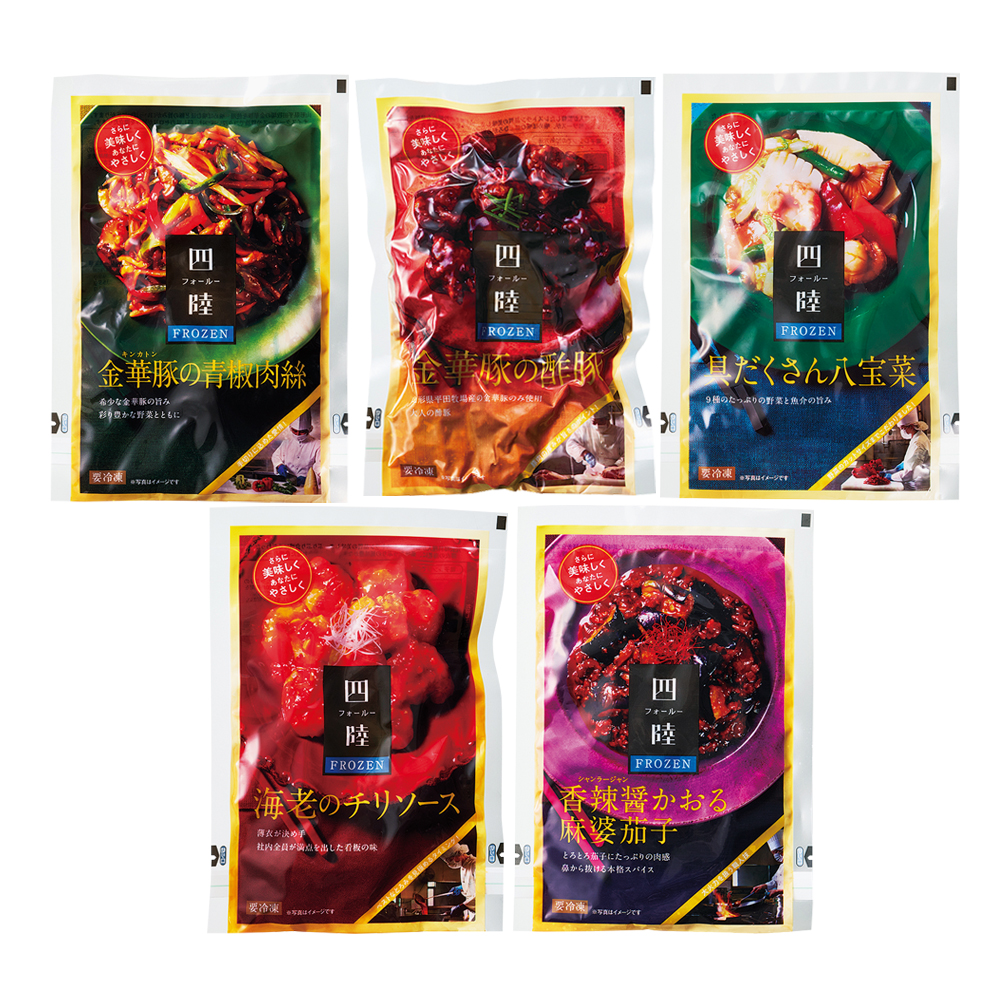 海老のチリソース150g・金華豚の酢豚150g・具だくさん八宝菜170g・金華豚の青椒肉絲150g・香辣醤かおる麻婆茄子180g×各1袋、5種計5袋
