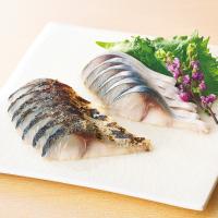 脂が程良くのった国産のさばを、手作業で丁寧に酢〆にした「しめさば」。表面を炙って香ばしさを出した「炙りしめさば」とセットで。
