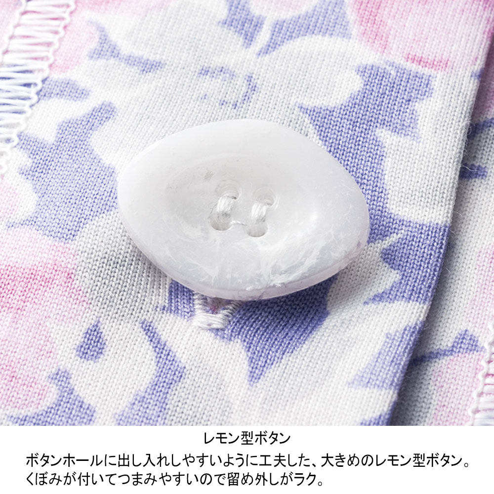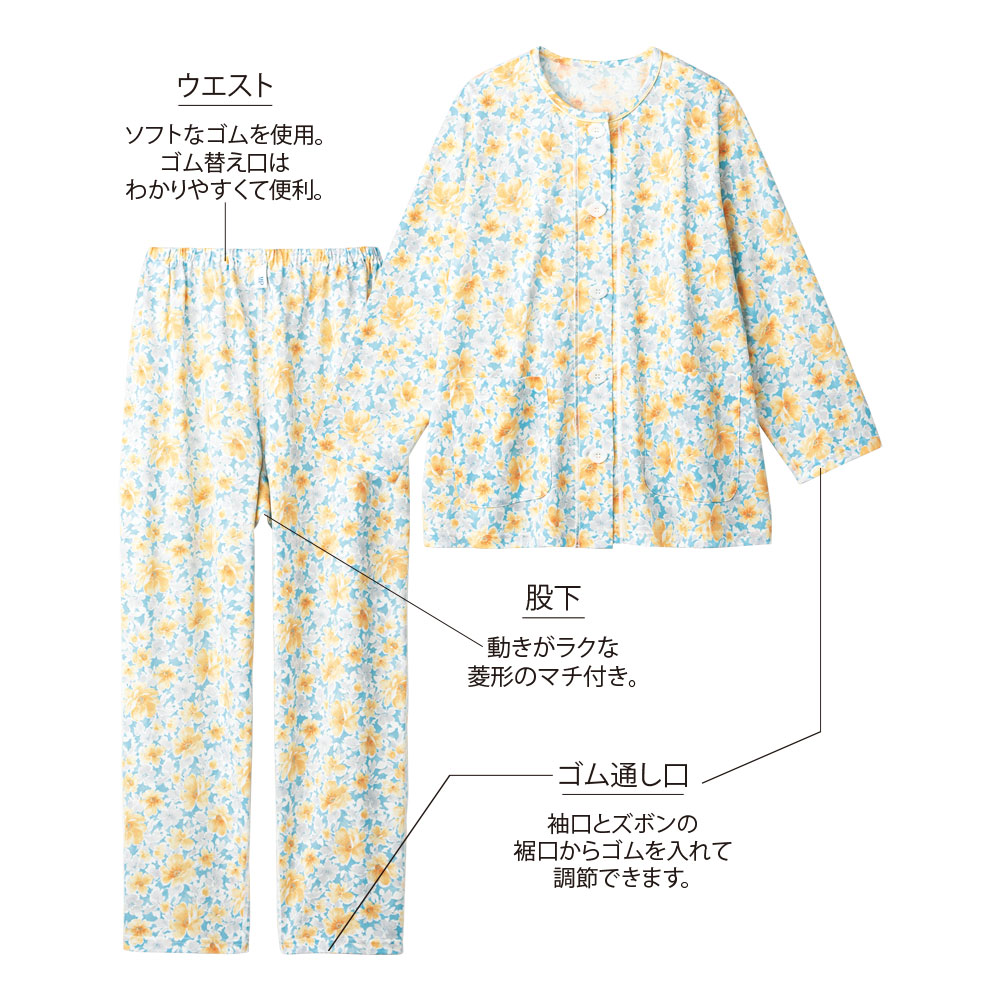 上衣:レモン型ボタン、左右ポケット付き、パンツ:ウエスト総ゴム(取替口付)