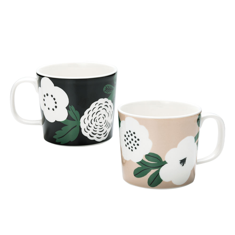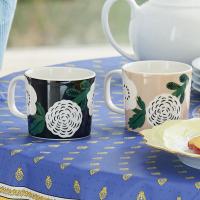 花冠の意味を持つ大きなお花がモチーフになったデザインで、シックなブラックとくすみカラーのベージュがおしゃれなペアです。電子レンジ、食洗機対応の実用的なマグカップです。