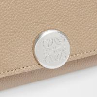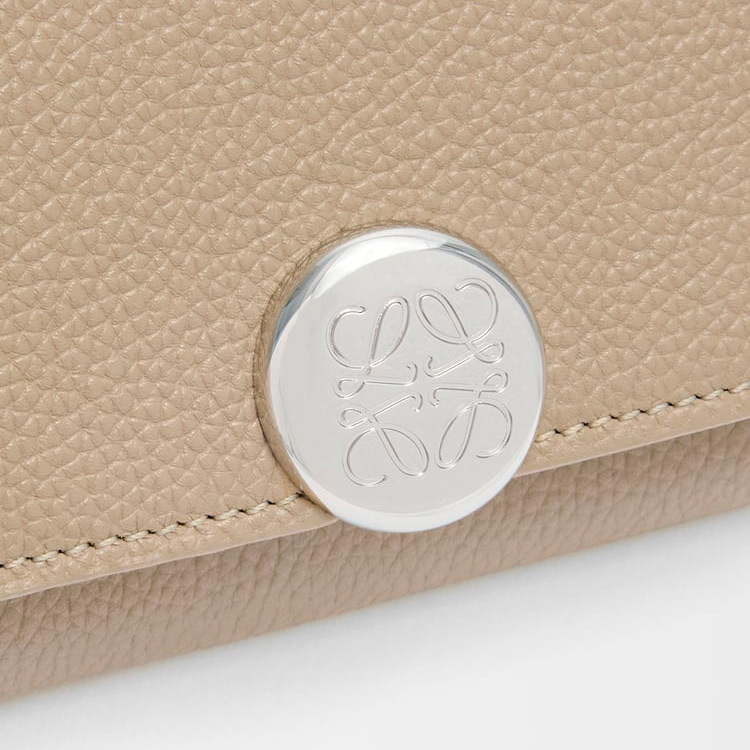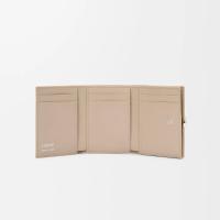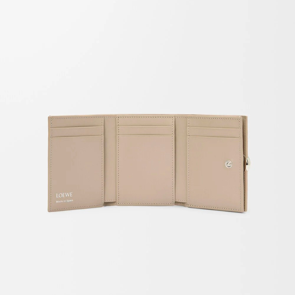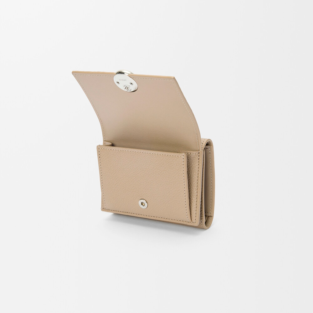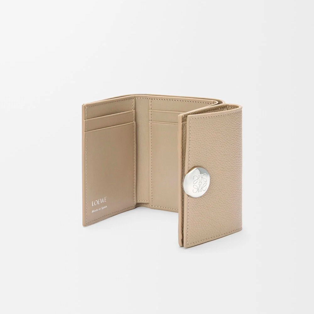 ペブルグレインカーフスキンを採用したトライフォールドウォレット。シグネチャーのアナグラムぺブルのクロージャーがあしらわれています。
