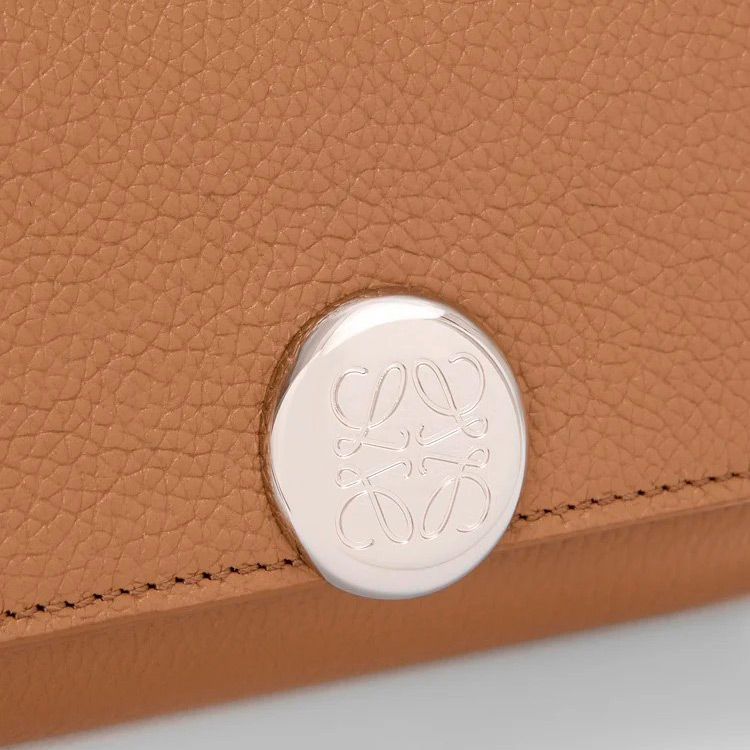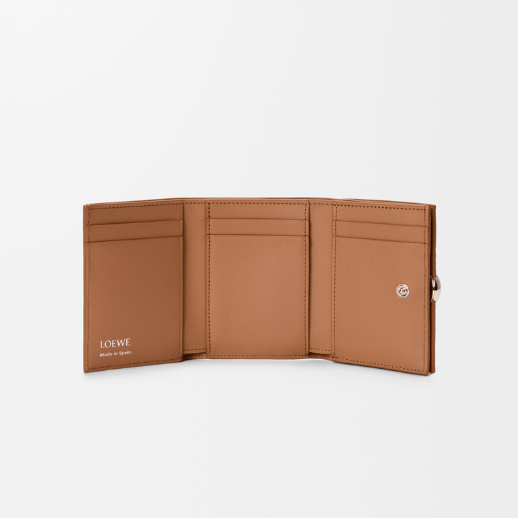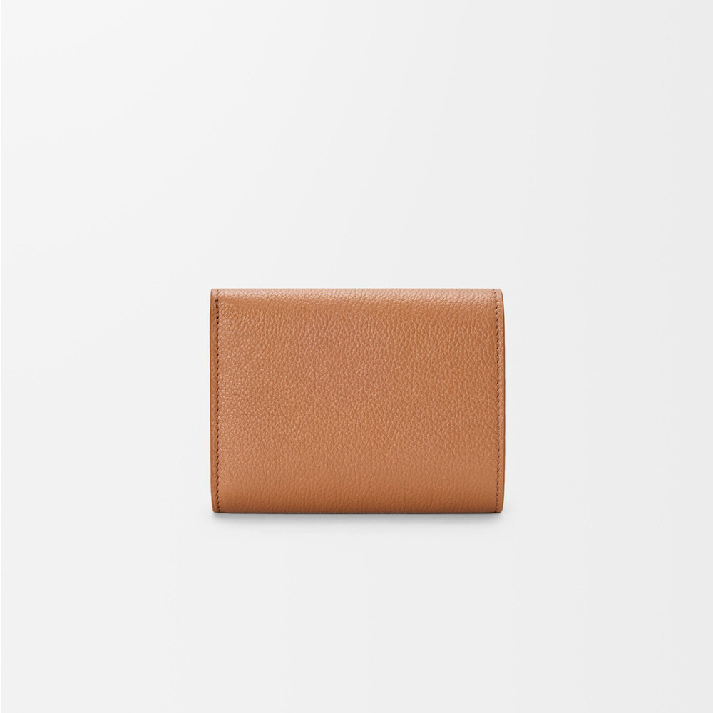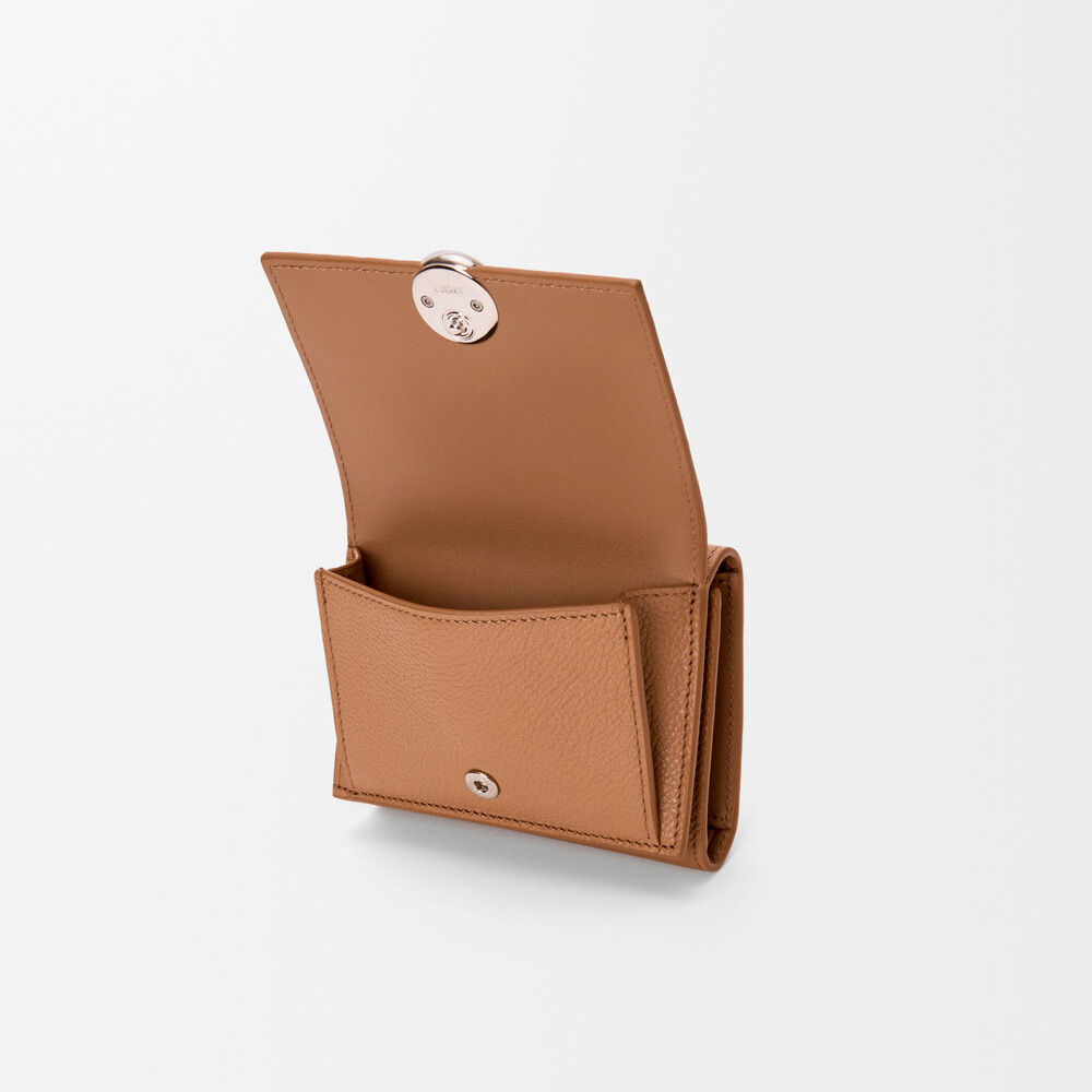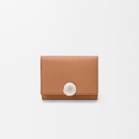 ペブルグレインカーフスキンを採用したトライフォールドウォレット。シグネチャーのアナグラムぺブルのクロージャーがあしらわれています。