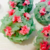 萌ゆる新緑の間から顔を覗かせる赤色のツツジをきんとんで表現しました。
