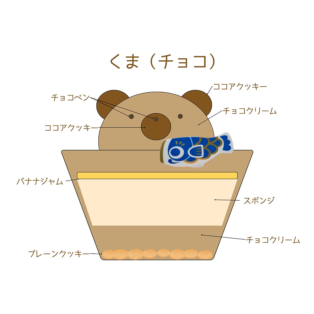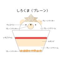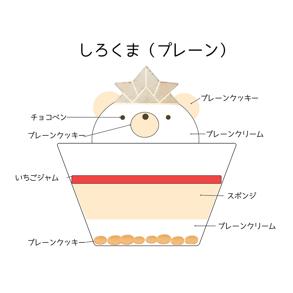 プレーンクッキーを敷き詰め、豆乳クリームにはジャムを忍ばせました。層になっているので、スプーンですくう度に違う味をお楽しみいただけます。しろくま:プレーンクリーム&いちごジャム。くま:チョコレートクリーム&バナナジャム。2種のケーキをご用意いたしました。※有機豆乳、米粉(国産)、アーモンドパウダーなどの食材を使用しております。※飾りは食べられません。