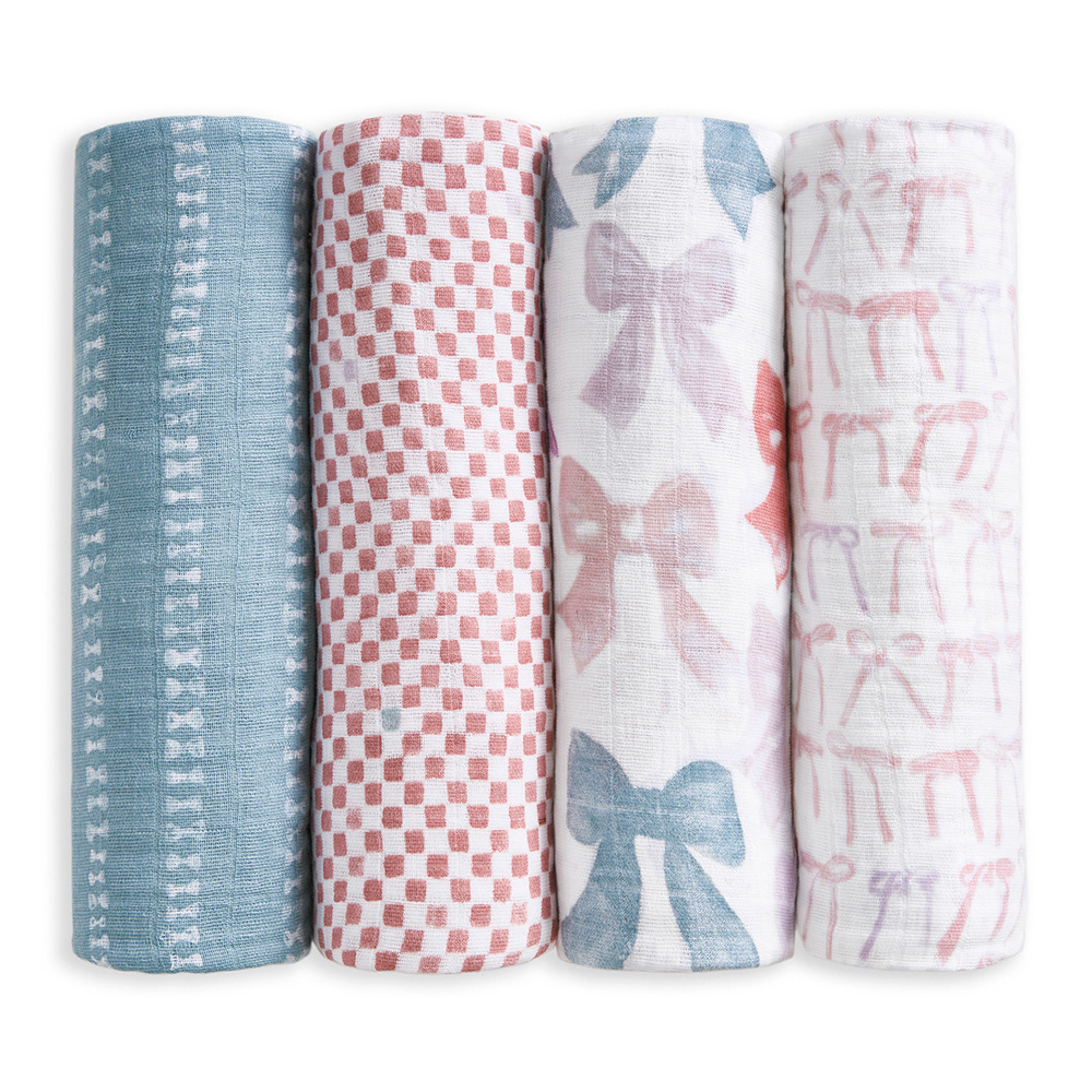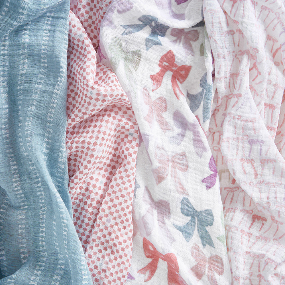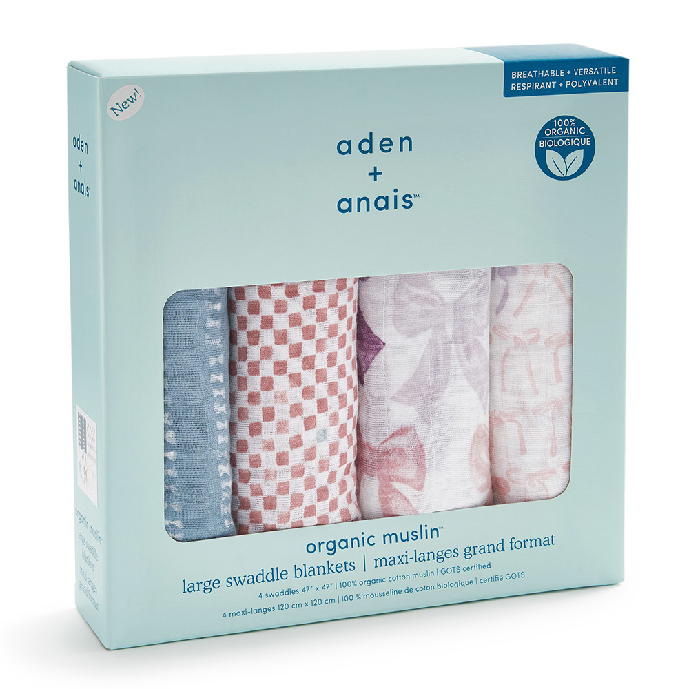 洗い替えや用途別に使い分けられる4枚セットで、毎日の育児に欠かせないアイテムです。 コットンモスリンは、伝統的におくるみとして愛用されてきた通気の良い素材。細やかな織りが特徴で、ムレを防ぎながら、赤ちゃんを快適にサポートします。 スワドルを使って赤ちゃんを優しくしっかり包むことで、まるでママのおなかの中にいるような安心感を与えられるといわれています。 エイデンアンドアネイのスワドルは、ダブルガーゼの柔らかさが魅力。赤ちゃんのお肌に優しく、使うたびに心地よく。GOTSとは オーガニック繊維製品を製造加工するための国際基準です。原料から最終製品まで、製造の全ての工程において環境的・社会的に配慮した方法で製品をつくるための基準です。 環境保全、自然に配慮した製品への注目が高まる中で、aden + anais(エイデンアンドアネイ)は未来の子供たちのためにできることの一歩としてオーガニックコットン素材のコレクションを提案します。 おくるみとしてだけでなく、ベビーカーの日よけや授乳ケープ、おむつ替えシート、プレイマット、吐き戻しの汚れカバーとしても活躍します。 大判サイズなので多用途に使え、外出時もコンパクトにたたんで持ち運べる便利さが魅力です。