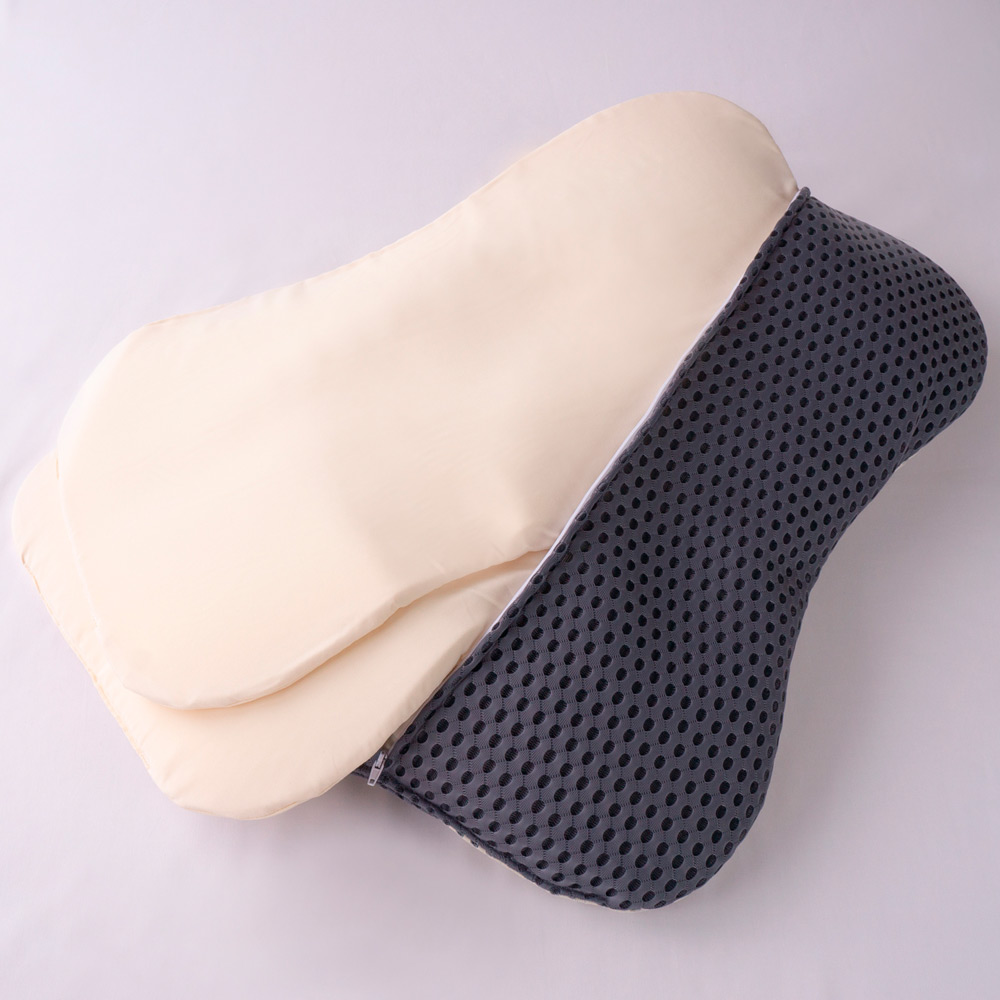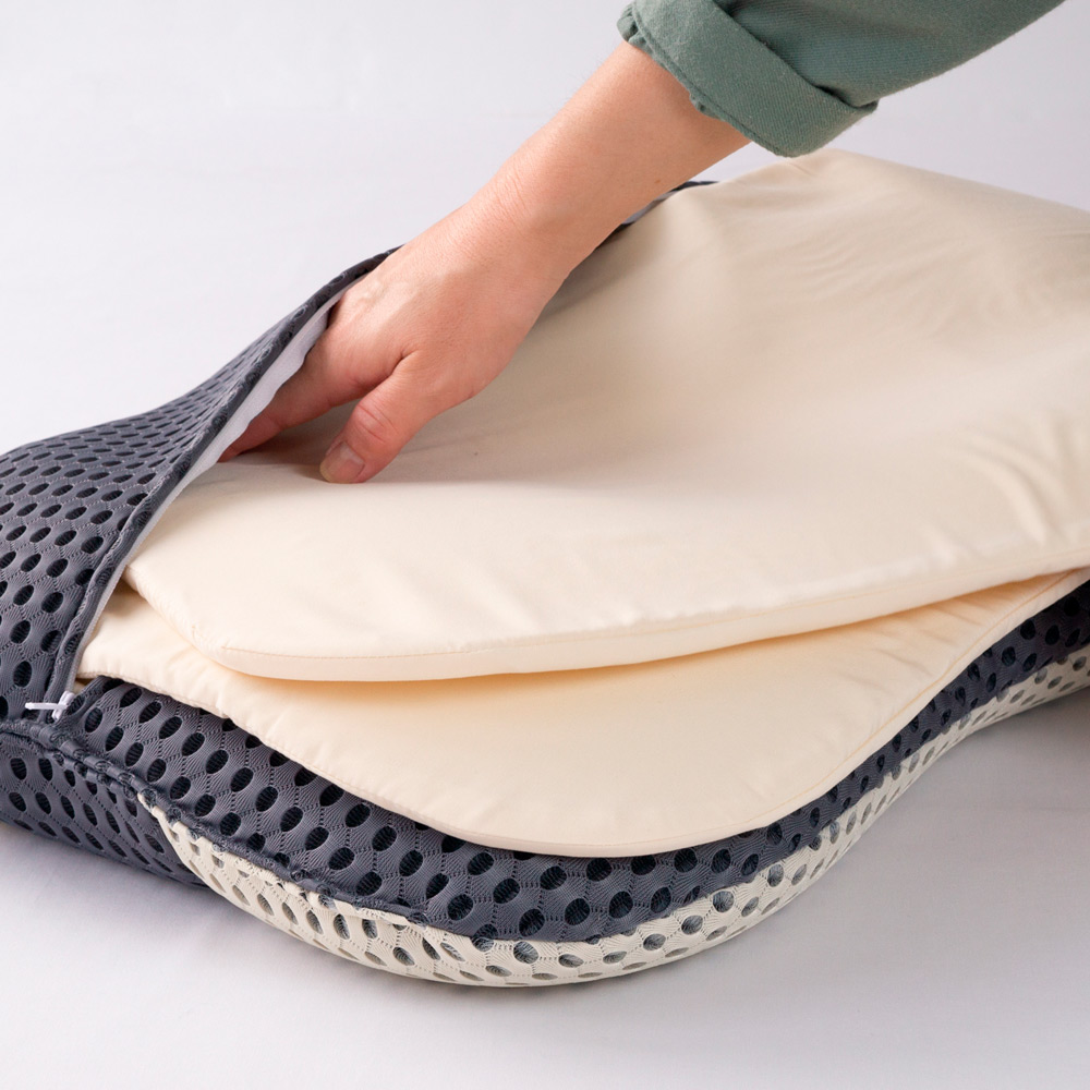 中材のソフトパイプの独自形状は適度な弾力で頭部と頸椎をしっかり支えます。側地は通気性のよい3Dメッシュ生地を使用、頭部の熱を放出し夏場でも蒸れにくく快適な睡眠環境をつくります。調整シートを取り外してまくら本体は洗濯機で洗っていただけるので、清潔にお使いいただけます。(洗濯機弱・ネット使用・タンブラー乾燥不可)