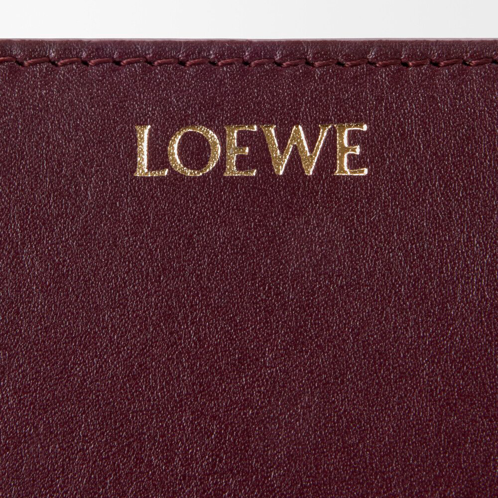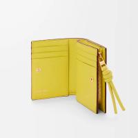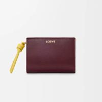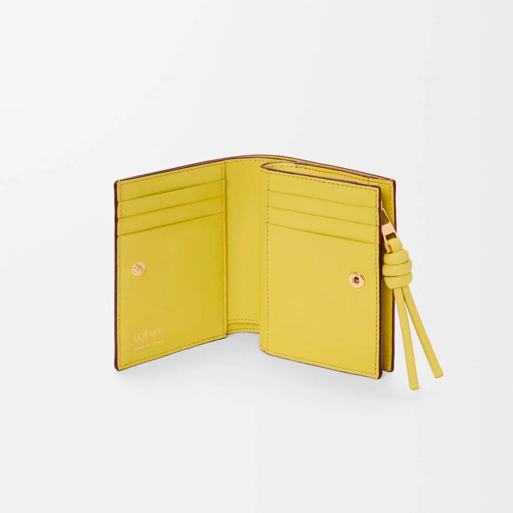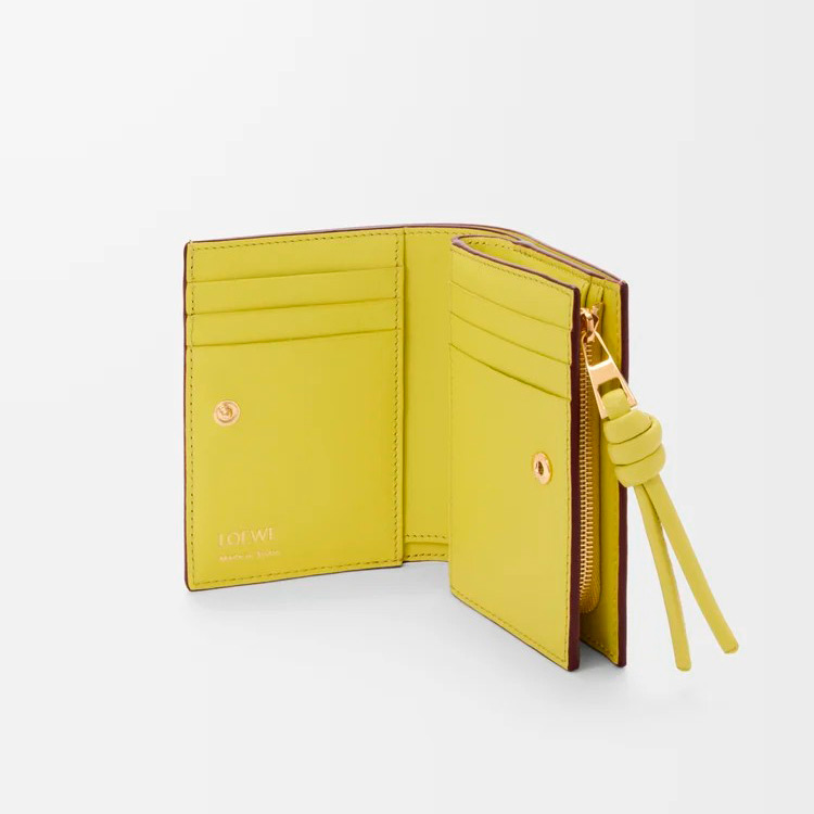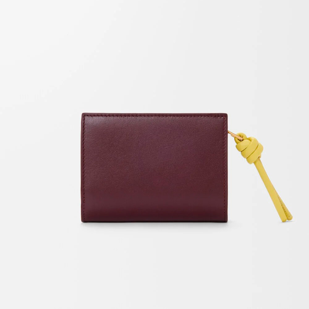 シャイニーナパカーフスキンを採用したコンパクトウォレット。コントラストカラーのノットのジップ引き手付き。