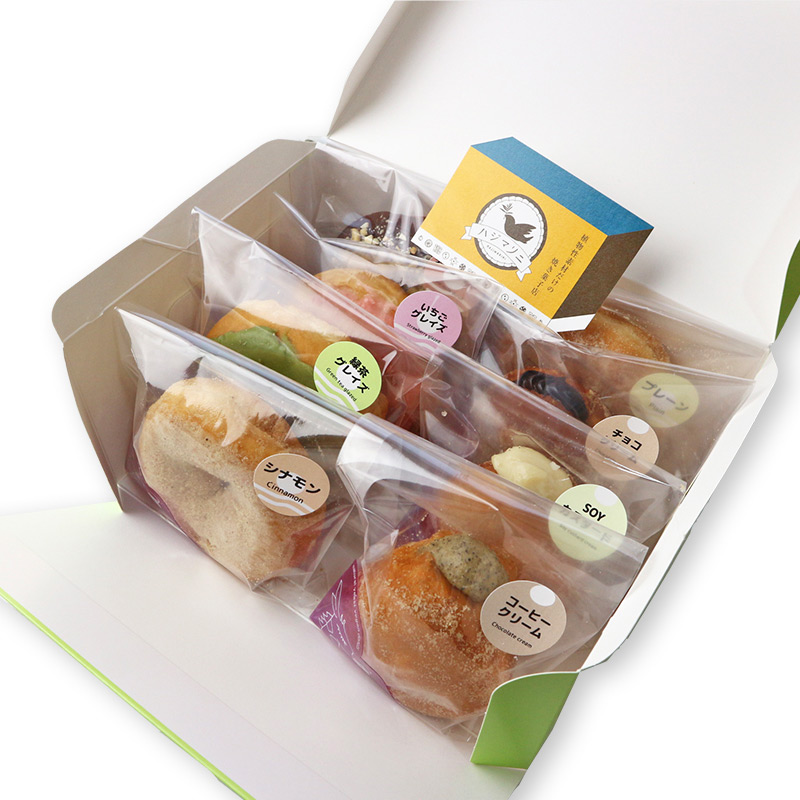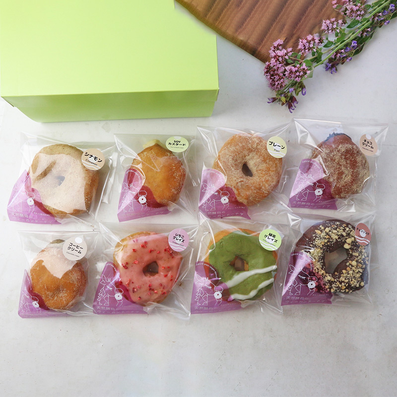 プレーン、シナモン、きなこ、SOYカスタード、チョコクリーム、チョコリング、季節のクリーム1種、季節のグレイズドーナツ1種 各1個 合計8個
