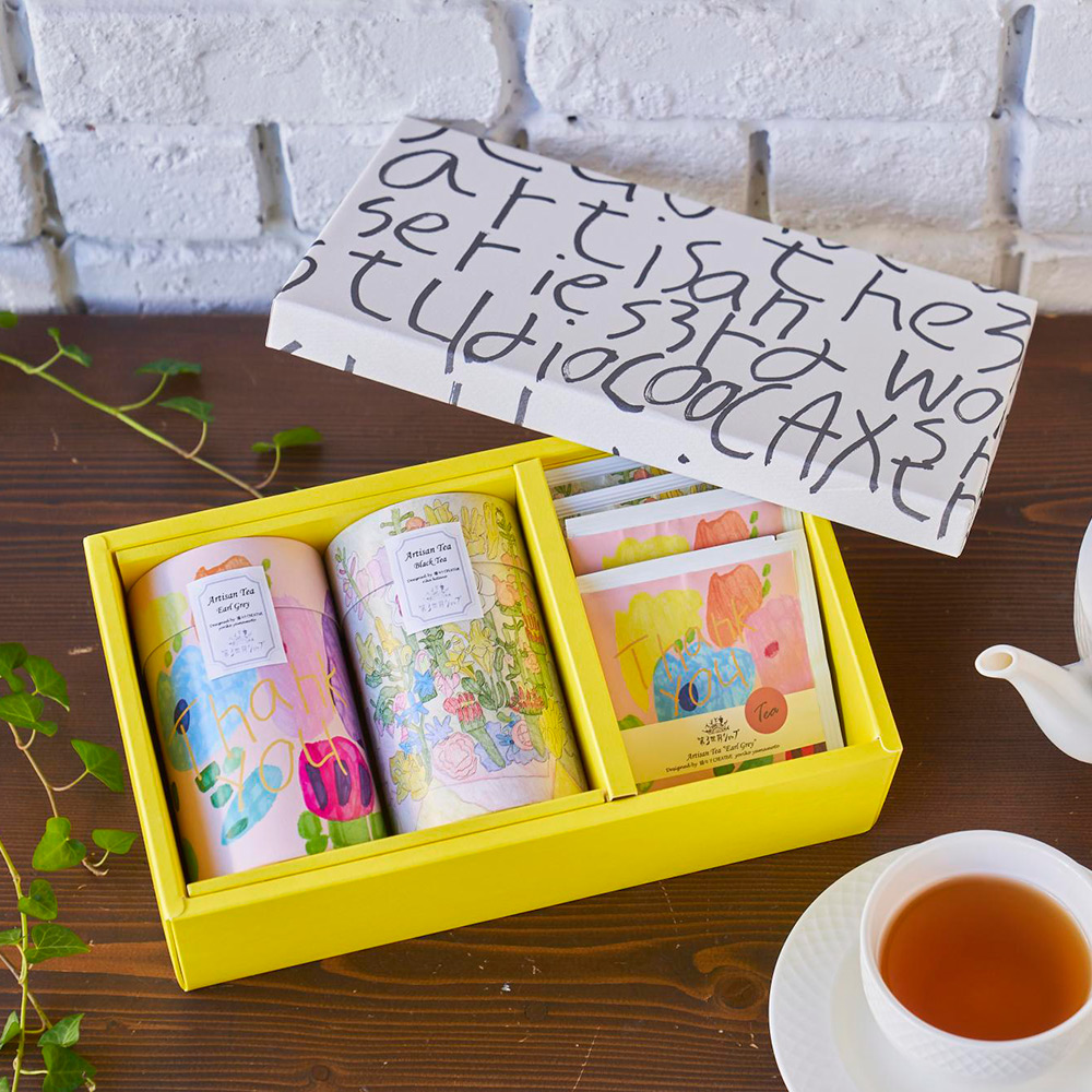 カードタイプのカタログギフト[e MY DEAR]と[Artisan Tea Selection]のギフトセットです。「Thank you」や「花束」のデザインが印象的なパッケージです。