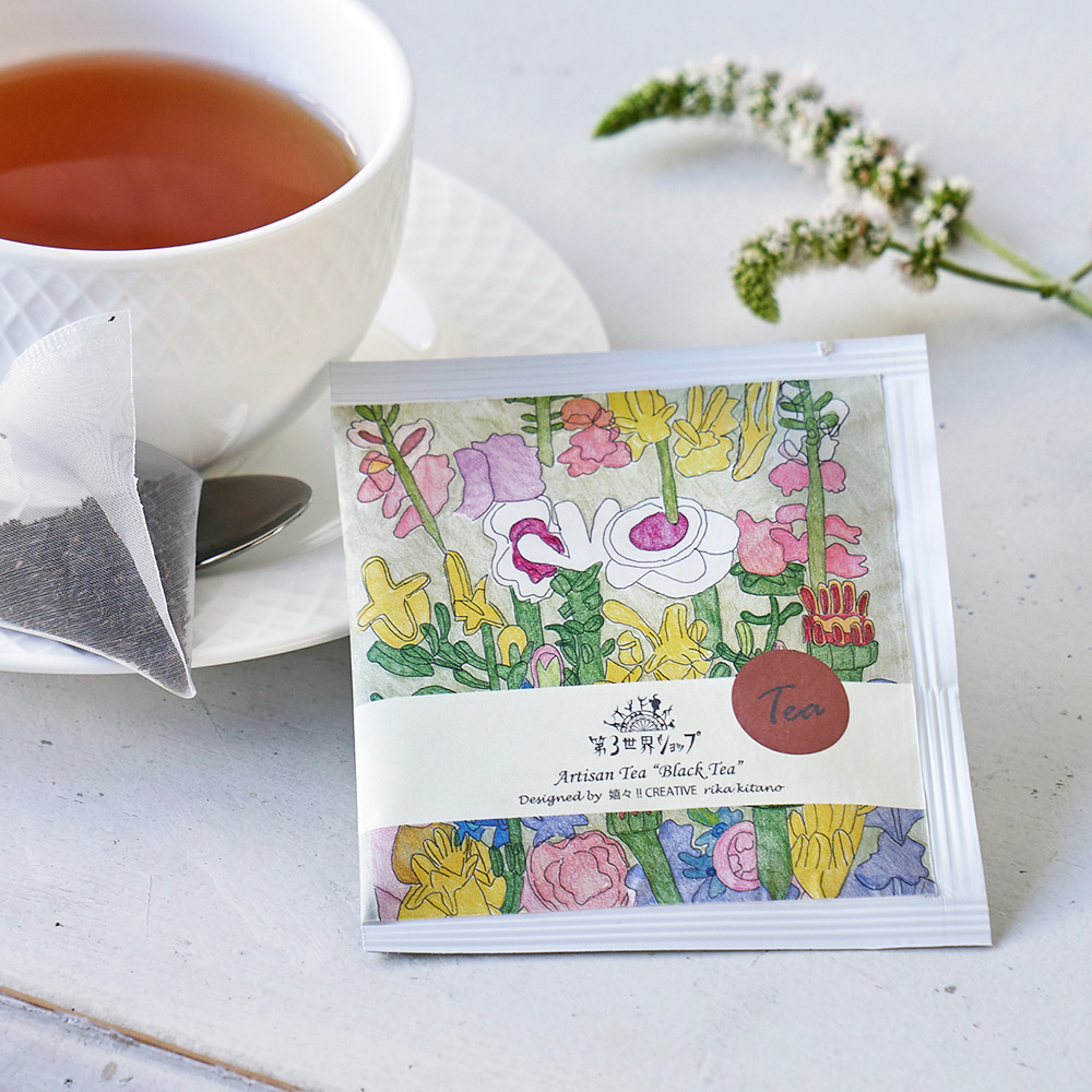<e MY DEAR> スタイリッシュなカードタイプのカタログギフト。暮らしを彩るテーブルウェアや、気持ち華やぐビューティーアイテム、心ときめくスウィーツなど。美しく、豊かな時間を過ごすためのアイテムを豊富に集めました。 <Artisan Tea Selection> ティーバッグタイプのアールグレイティーとブラックティーの2種類の紅茶が楽しめるギフトセット。インド産オーガニックの茶葉を使用。パッケージは、様々な障がいを持つ人が、好きなこと・得意なことで活躍する福祉施設/アトリエ 嬉々 CREATIVE(キキ・クリエイティブ)の個性的なアーティストたちが彩ってくれています。アールグレイティーは、ベルガモット精油で香りをつけた、上品で華やかな香りです。ブラックティーは、口当たりが優しくまろやかで、渋みが少なめの飽きのこないタイプの紅茶です。ティーバッグには生分解フィルム(植物の澱粉が原料、土に還ります)を使用。「Artisan」とは英語で「職人」という意味です。手間を惜しまず「おいしさ」「感動」を届けてくれる生産者、世界に1つしかないデザインを生み出す嬉々 CREATIVEのアーティスト、彼らの職人技に敬意をこめて名付けたシリーズです。