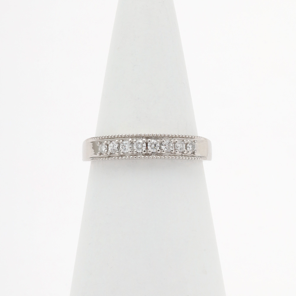 指先を上品に彩るプラチナ900と8石の天然ダイヤモンドが織りなす一文字リング。最大の特徴は、ダイヤモンドを縁取る繊細な「ミル打ち風」加工。クラシカルなディテールが指元にさりげなく華やかな表情を与えます。最大幅3mmという絶妙なボリューム感は日常のあらゆるシーンに自然に溶け込むデザインです。計0.2ctのダイヤが放つ繊細な煌めきは、シンプルだからこそ際立つ本物の上質感です。【※利益還元のため、特別価格でご提供】