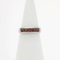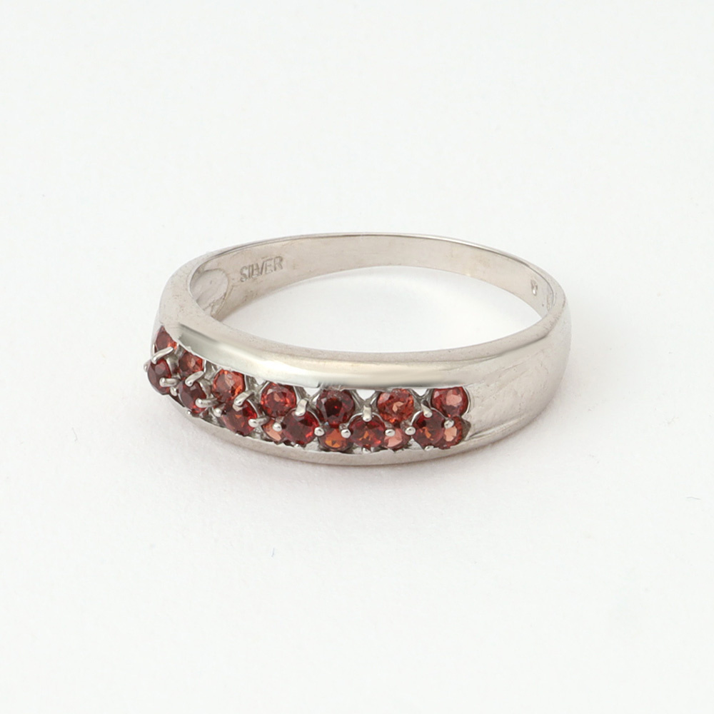 深みのある真紅の輝きが美しい天然ガーネットを贅沢に20石あしらったパヴェスタイルのリング。一石一石が放つ情熱的な色彩が連なり、指先に華やぎをもたらします。地金にはロジウムメッキを施したシルバーを使用。落ち着いた赤と凛としたシルバーのコントラストが、大人の女性の肌を、美しく引き立てます。最大幅5mmの程よいボリューム感は、シンプルなコーディネートの主役にも、重ね付けのアクセントにも最適。滑らかな甲丸デザインが、日常のシーンに寄り添いながら、装いに確かな気品を与えてくれます。【※利益還元のため、特別価格でご提供】