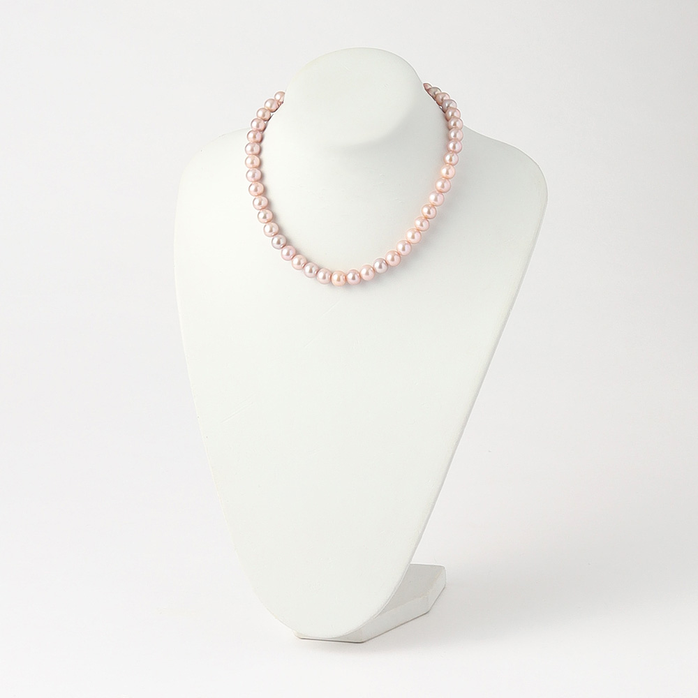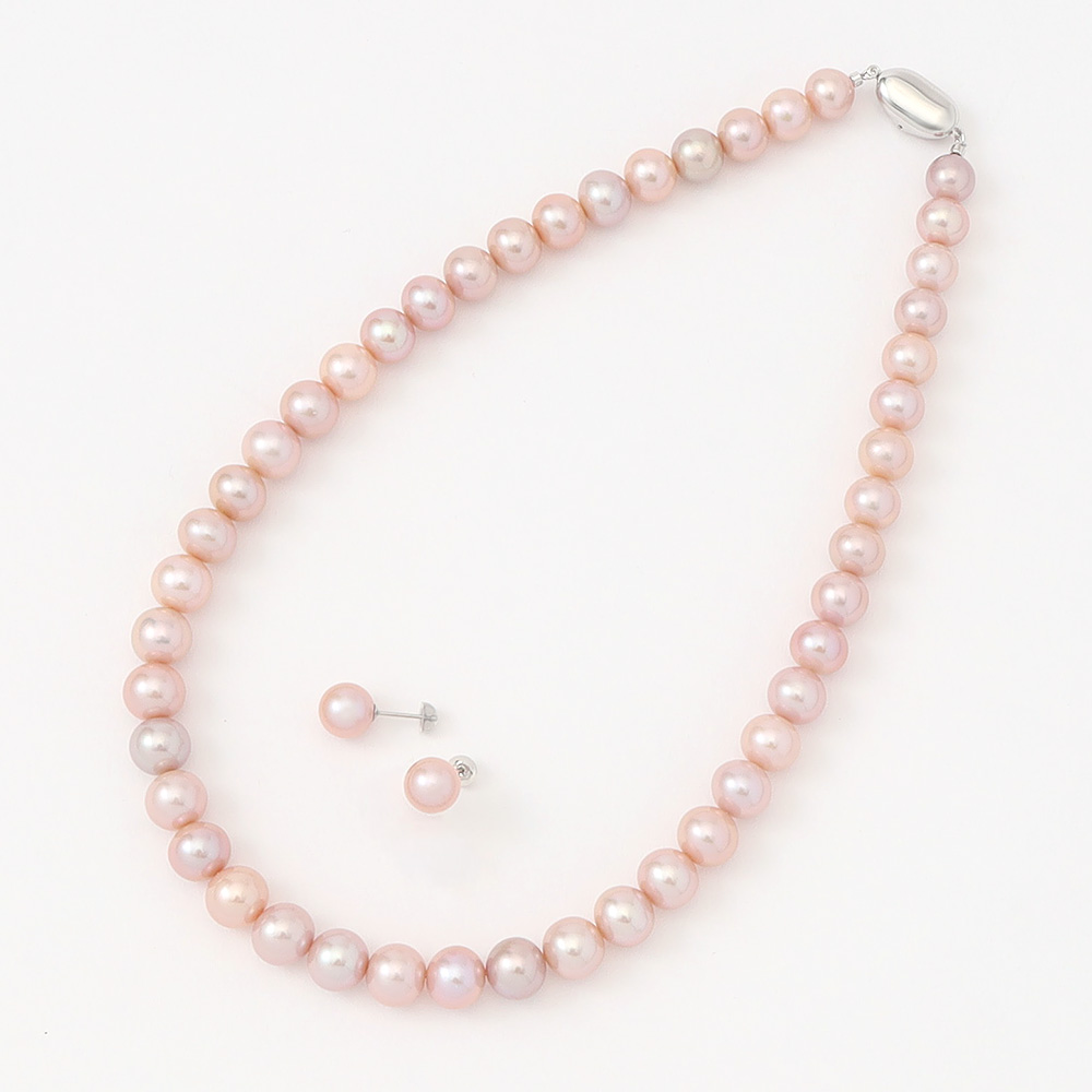 ホワイト系、オレンジ系、パープル系等、様々な色を生み出す淡水真珠。中でも他の種類の真珠にはないパープルピンク系は高貴な色合いが大変人気です。光沢の美しいラウンド系の珠を連ねて上質なネックレスに仕上げました。珠のサイズはグラデーションになっており、胸元の最も大きな珠は約9.5mmとボリューム十分です。【※利益還元のため、特別価格でご提供】