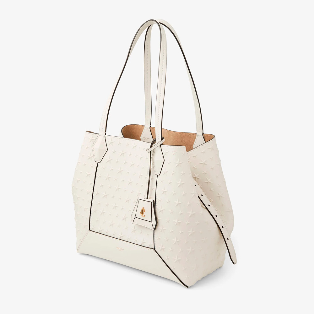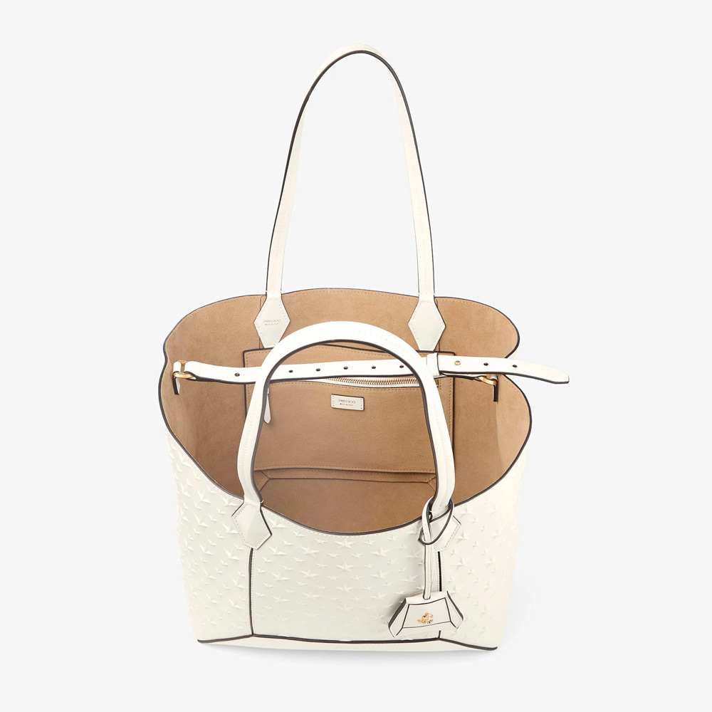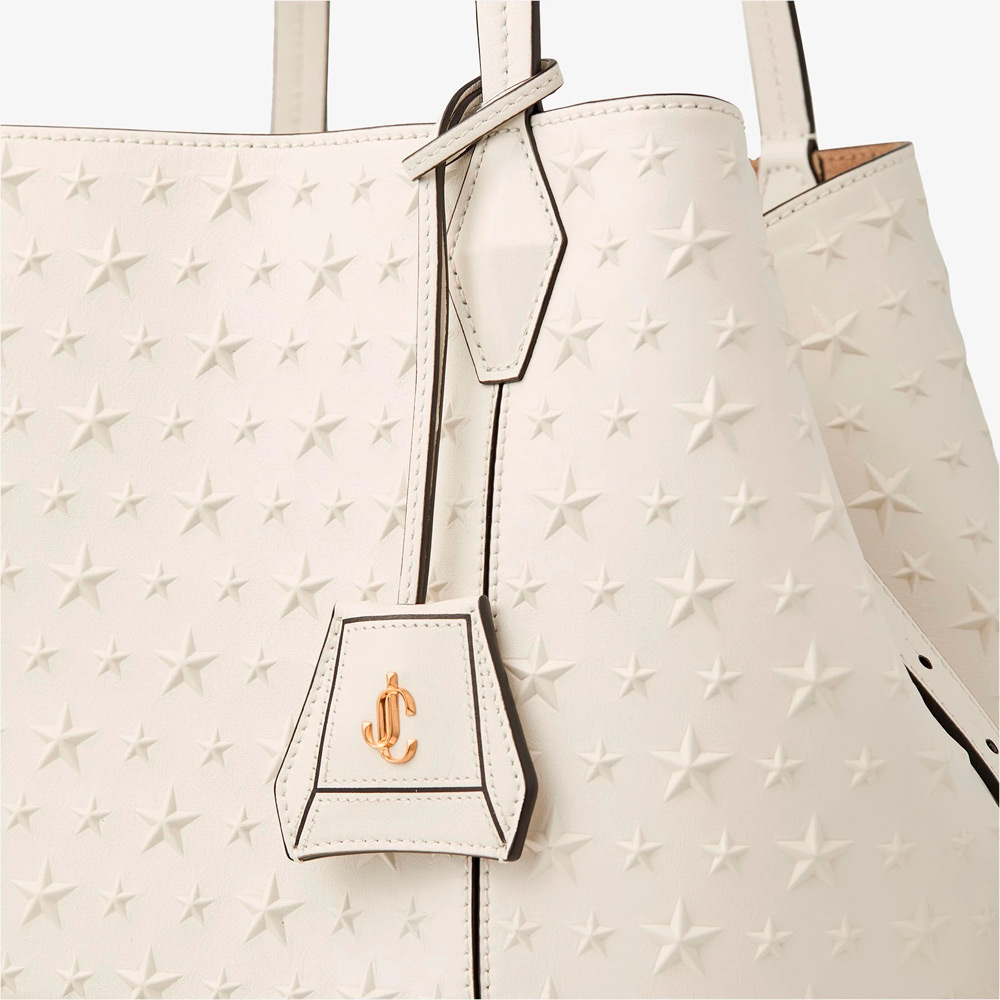 スムースカーフレザーにスターディテールのエンボス加工を施したダイヤモンド トート。構造的なシルエットにさりげないアクセントを加えています。スムースレザーのトリムがデザインを縁取り、細長いハンドルを引き立てます。JCモノグラムのタグがシグネチャーの仕上げを加えています。広々として洗練されたデザインで、日々のスタイルを格上げする理想的なキャリーオールバッグです。