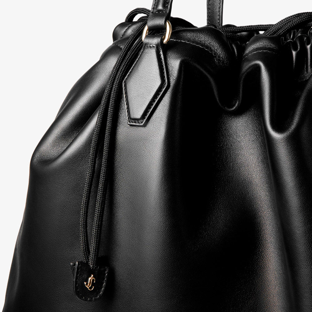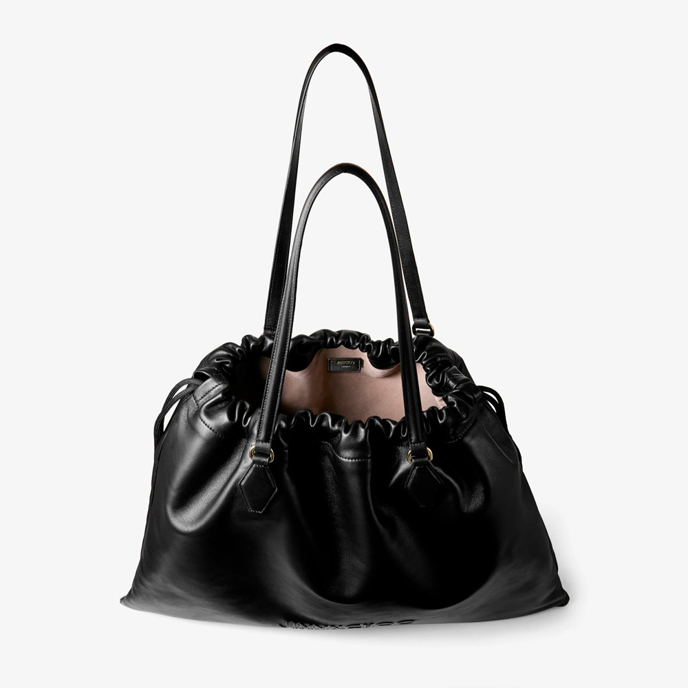 毎日のワードローブに欠かせない洗練された定番アイテムのドローストリングトートは、しなやかなナッパレザーを使用し、柔らかなフォルムと調整可能なサイドのドローストリングが特徴。エンボス加工されたジミー チュウのロゴが、タイムレスな気品を添えます。