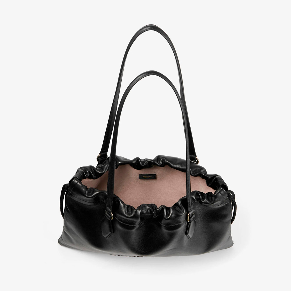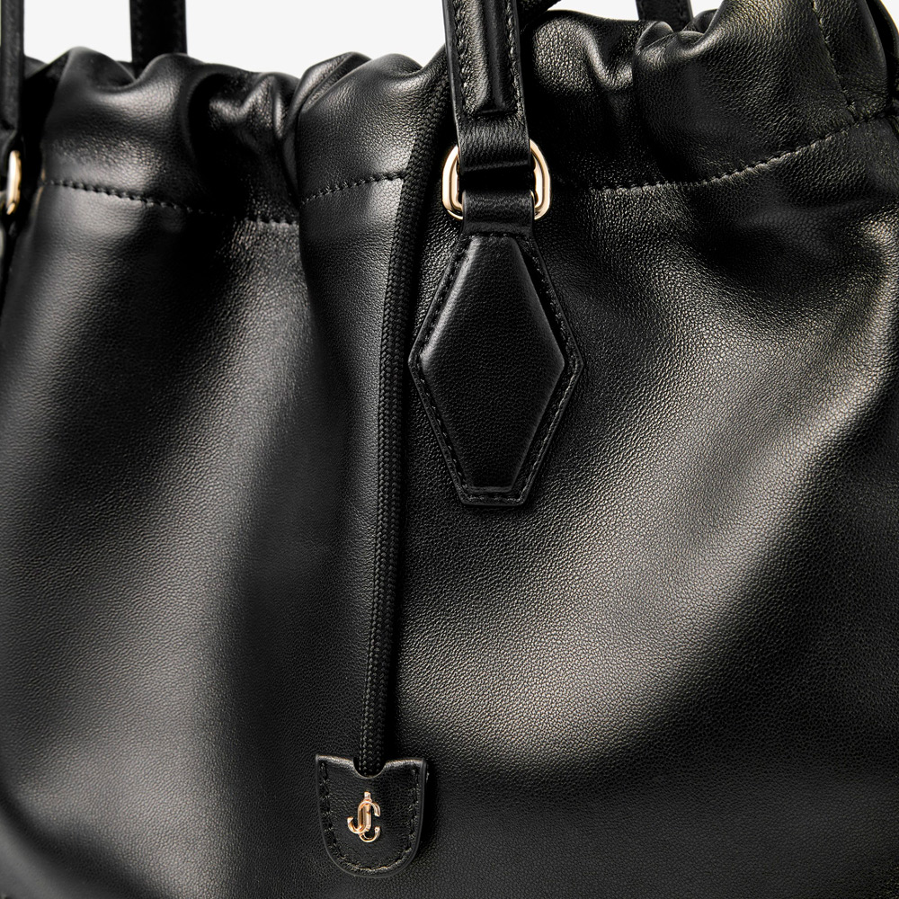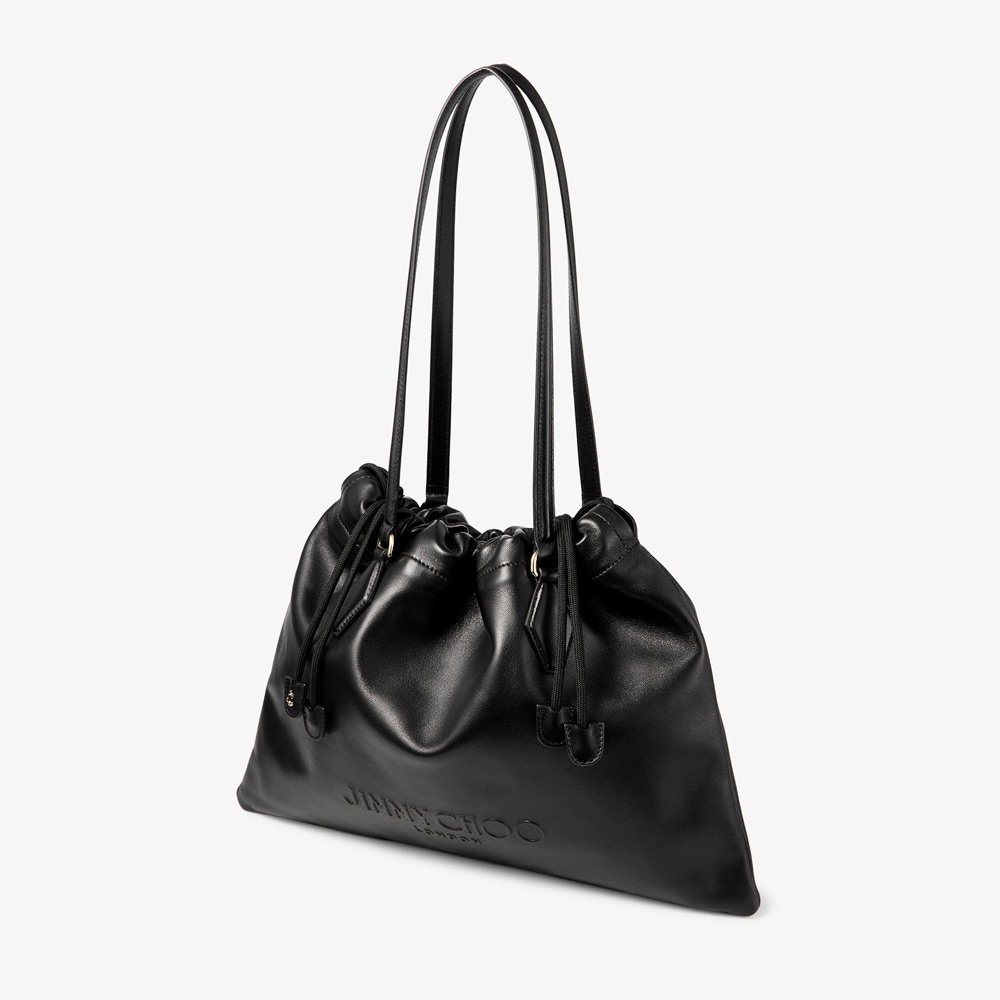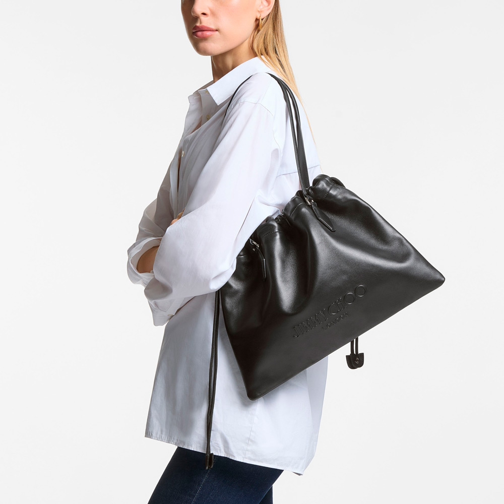 毎日のワードローブに欠かせない洗練された定番アイテムのドローストリングトートは、しなやかなナッパレザーを使用し、柔らかなフォルムと調整可能なサイドのドローストリングが特徴。エンボス加工されたジミー チュウのロゴが、タイムレスな気品を添えます。
