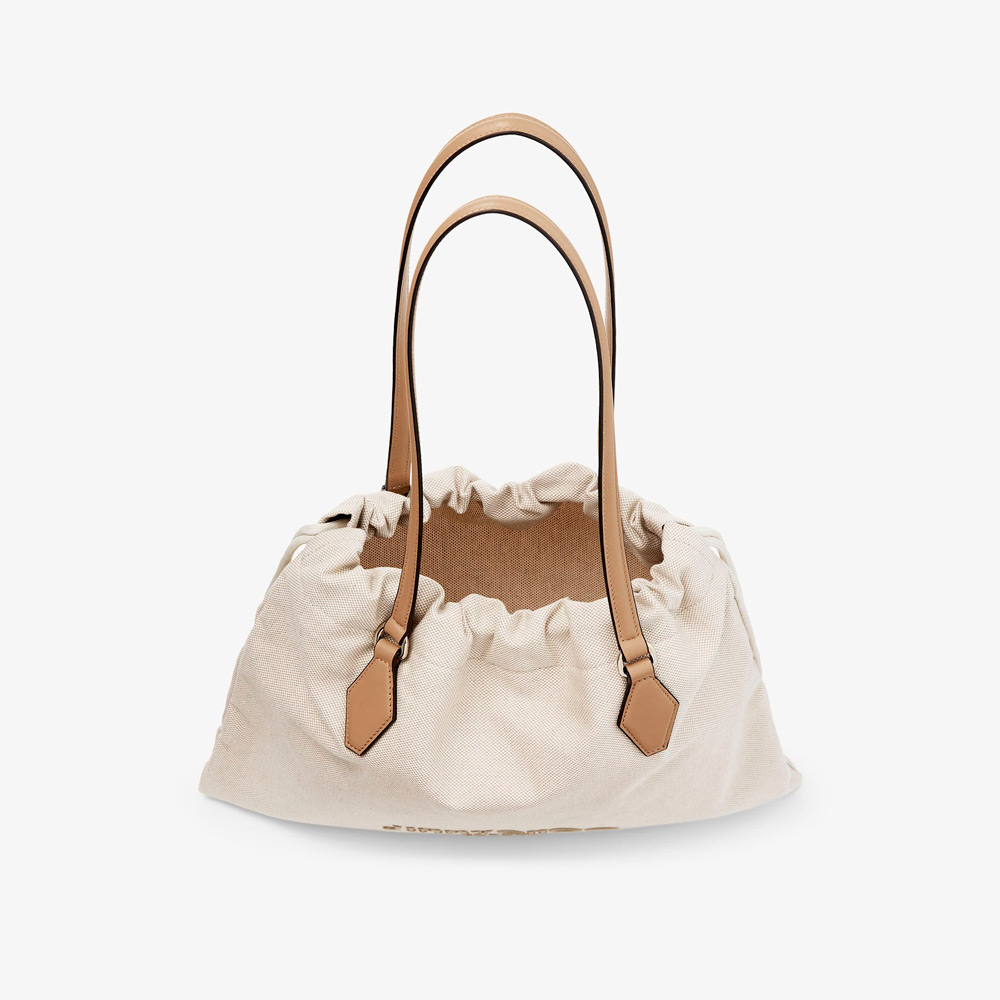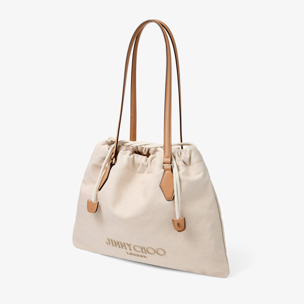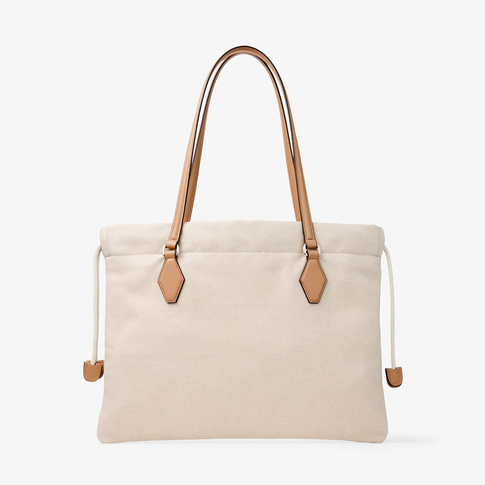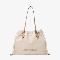 リラックスしたシルエットが魅力のスラウチーなドローストリングトートは、ドローストリングクロージャーで仕上げています。アーモンドカラーのウーブンラフィアを使用。コントラストの効いたスムースレザーストラップをアクセントに、Jimmy Choo Londonの刺しゅうロゴをあしらって仕上げています。