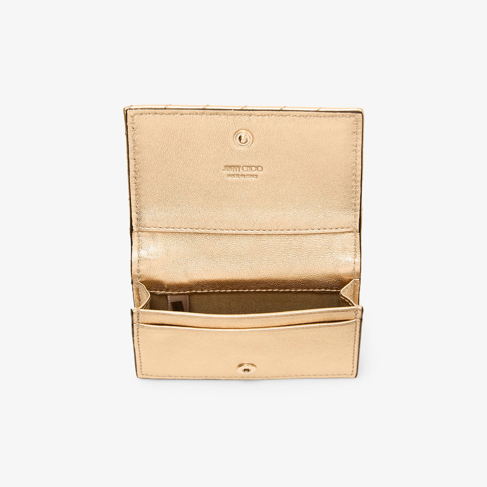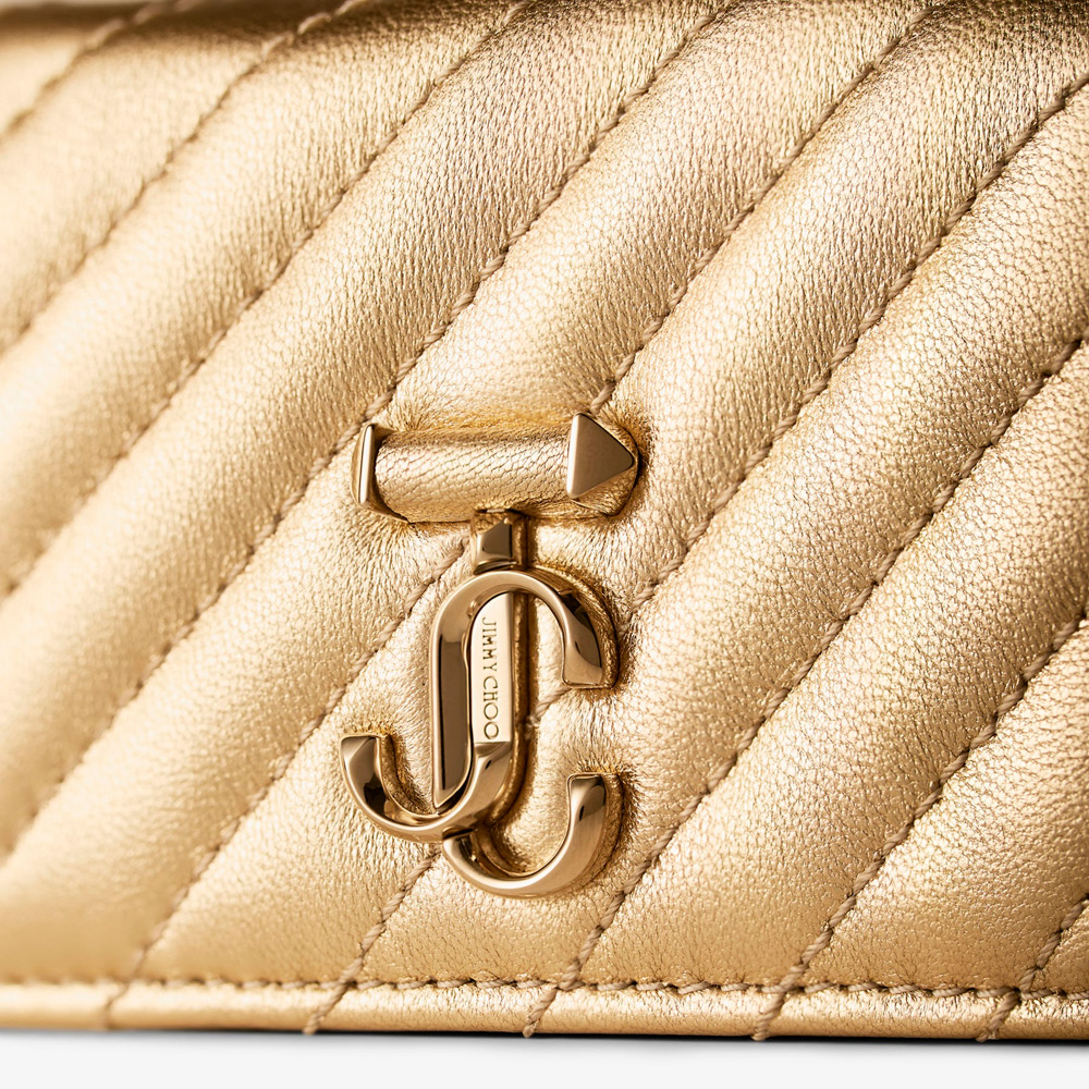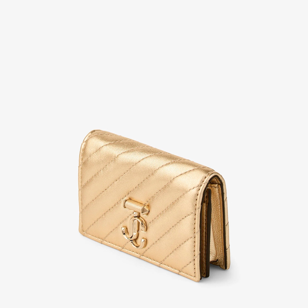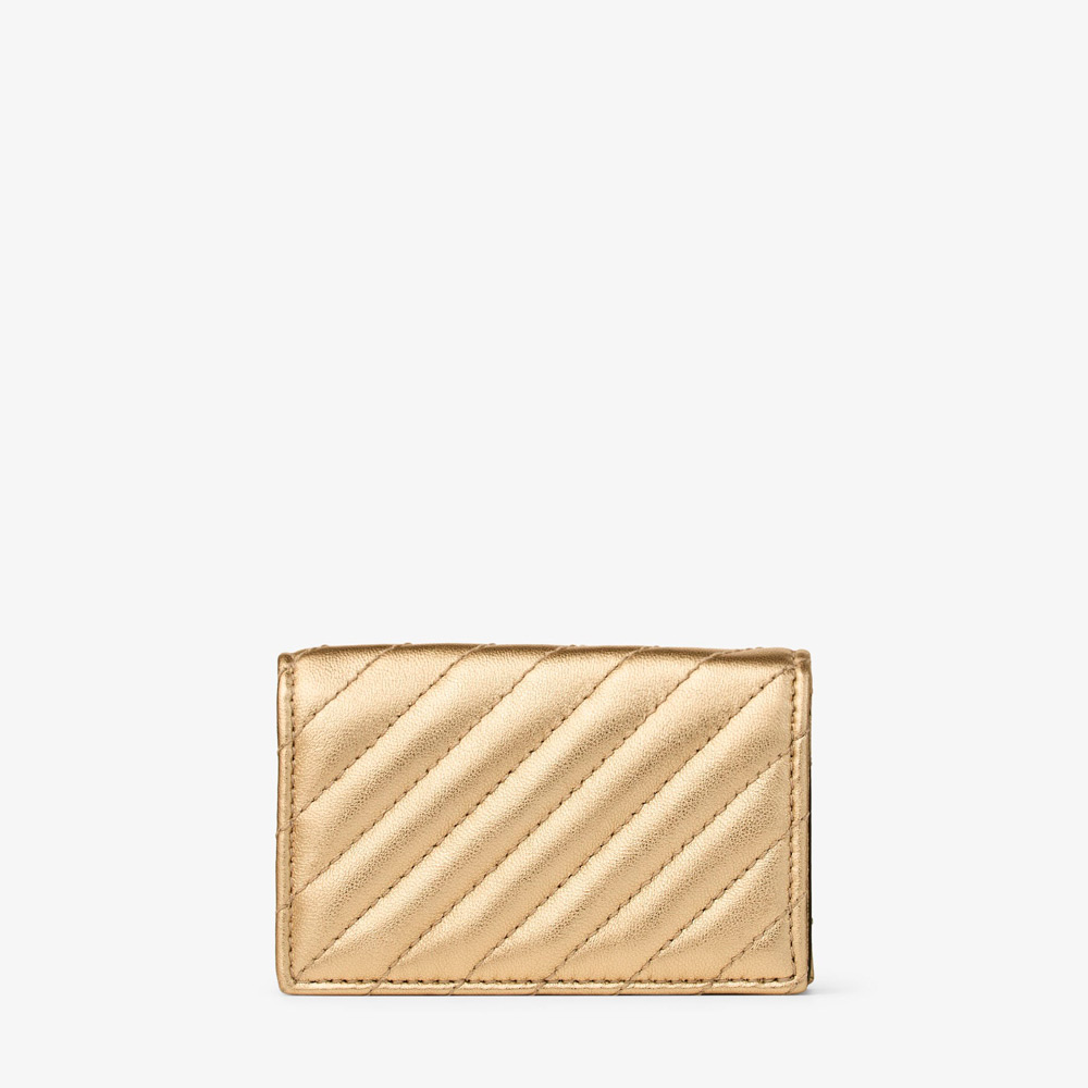 タイムレスかつコンテンポラリーなカーブ カードホルダーは、メタリックナッパレザーを使用。ストライプキルティングと複数のカードスロットを備え、JCモノグラムがアイコニックな輝きを添えています。