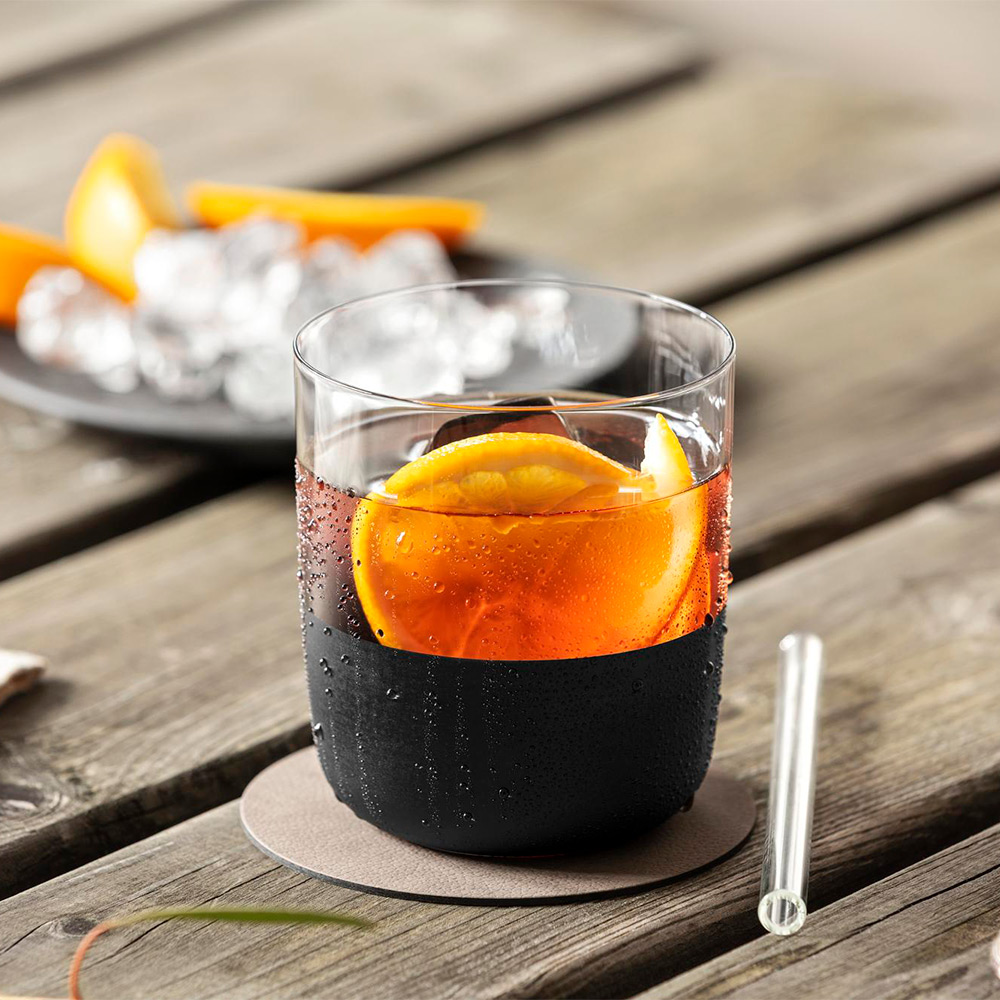 シンプルなストレートデザインと、クリアなガラスとマットブラックのコントラストが、エレガントでクールな印象。 水やジュースなどのソフトドリンクはもちろんのこと、ウイスキーグラスとしてなどハードドリンクにもおすすめです。