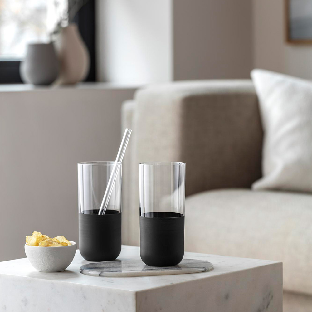 シンプルなストレートデザインと、クリアなガラスとマットブラックのコントラストが、エレガントでクールな印象。 水やジュース、アイスコーヒーやアイスティーなどのソフトドリンクはもちろんのこと、ハイボールやモヒートなどのハードドリンクにも最適です。