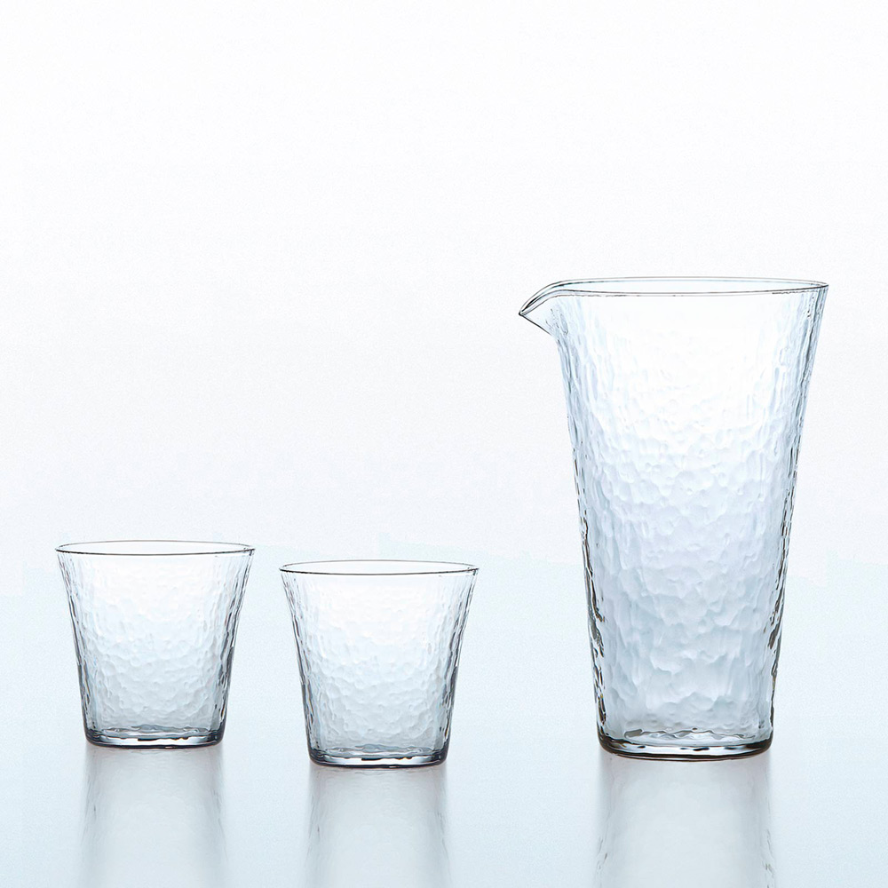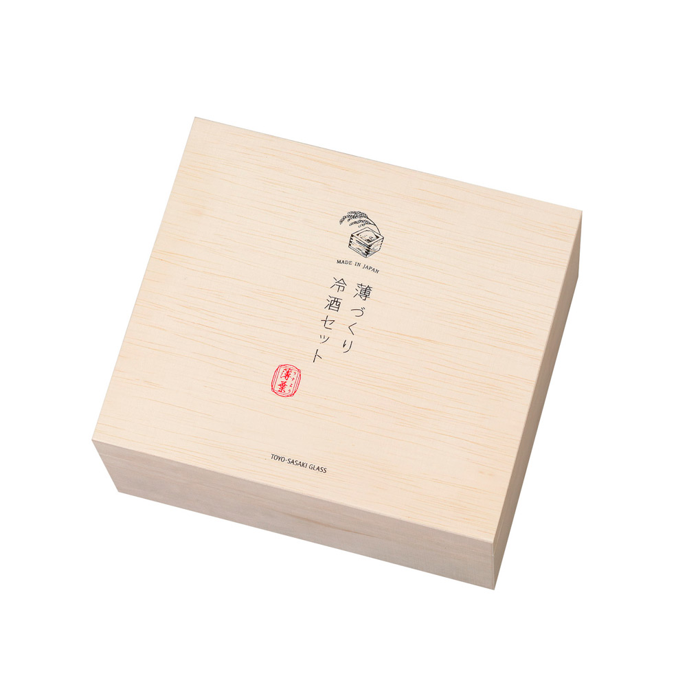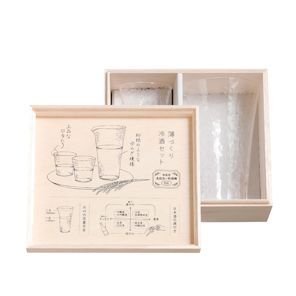和紙のようなゆらぎ模様と上品な口当たりが特長の酒杯と片口の冷酒用セットです。専用木製ケースのふた裏面に「グラスの特長と日本酒の選び方」付き。おうち時間のお供や、お酒好きの方へのプレゼントに最適です。