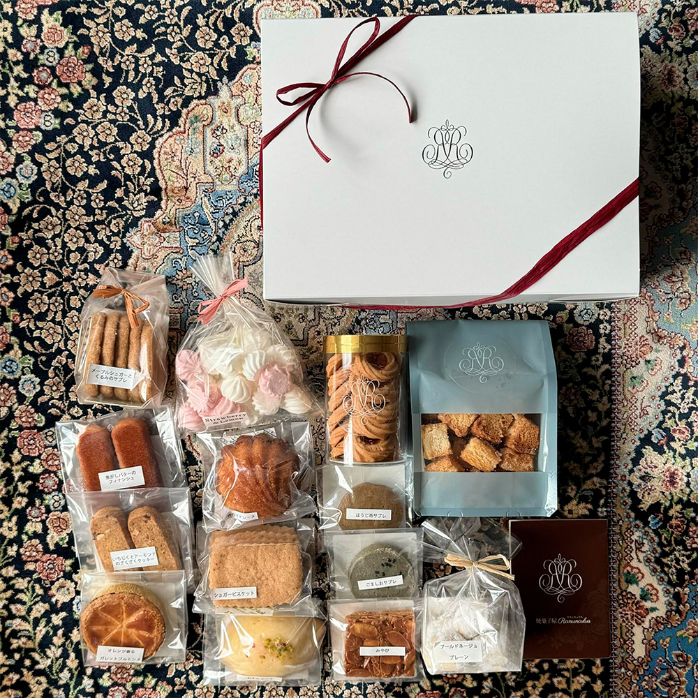 メープルシュガーとくるみのサブレ、焦がしバターのフィナンシェ、いちじくとアーモンドのざくざくクッキー、オレンジ香るガレットブルトンヌ、いちごとレモンの焼きメレンゲ、きび糖のマドレーヌ、シュガービスケット、れもんケーキ、ヴィエノワ シナモン&ラズベリー、ほうじ茶サブレ、ごましおサブレ、みやびのフロランタン、シュガーラスク、ブールドネージュ プレーン 各1袋 計14個