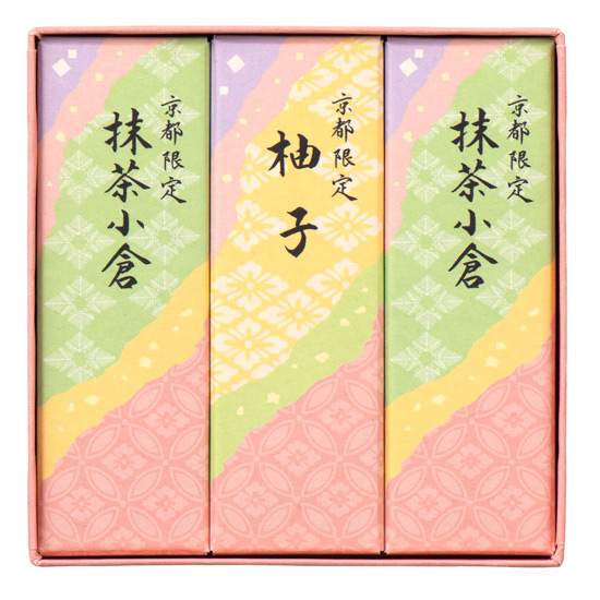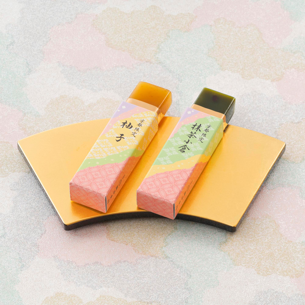 「京都府産宇治抹茶」を使用。通常商品「鶴屋吉信ようかん 抹茶」の2倍量の抹茶をたっぷりと使用した濃い味わいの抹茶羊羹に、丹波大納言小豆の蜜漬けを散りばめました。大変希少な「京都府産宇治抹茶」のかぐわしい香りと小倉の風味がよく合う、王道の美味しさ『抹茶小倉』京都・水尾地区産の柚子を使用。果肉をじっくり煮詰めた柚子ジャムと、細かく刻んだ柚子の果皮をこめた、甘く爽やかな柚子風味いっぱいの羊羹『柚子』。京都限定ならでは、雅な伝統柄をあしらった“はんなり”美しい特製パッケージ。コンパクトでお持ち帰りやすく、小物入れなどにしても可愛い特製箱はお土産にもぴったりです。