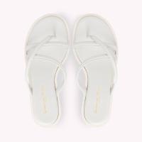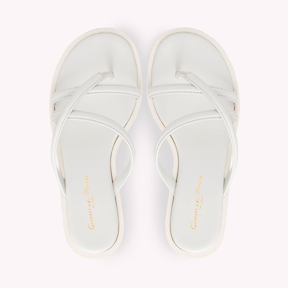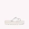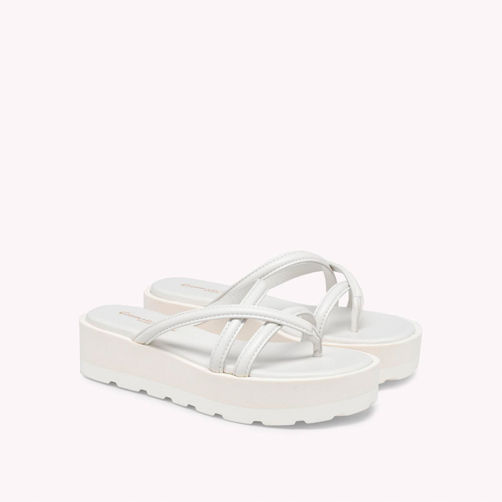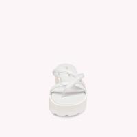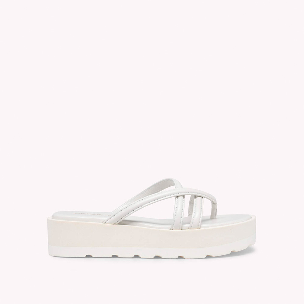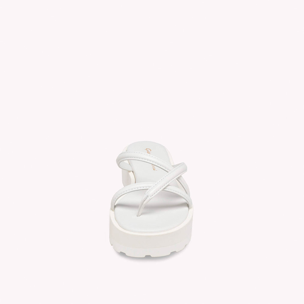 レザーから丹念に作り上げたラウンドトゥのトングサンダル、Nadina Thong。アシンメトリーなデザインのアッパーが目を引く一足です。フラットなプラットフォームソールの厚さは、前側が40mm、後ろ側が45mm。手作業によって仕上げました。