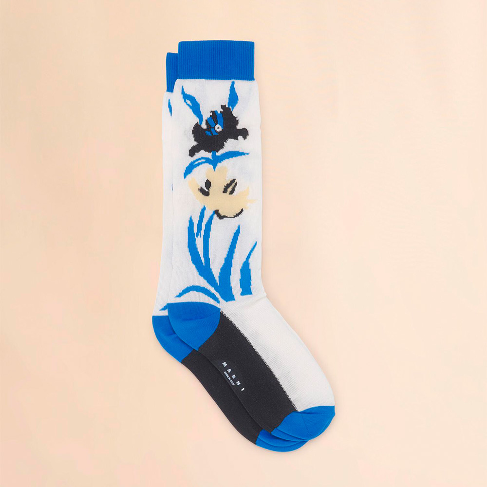 インターシャ編みでフラワーデザインをほどこしたコットン素材のソックス。