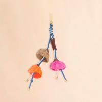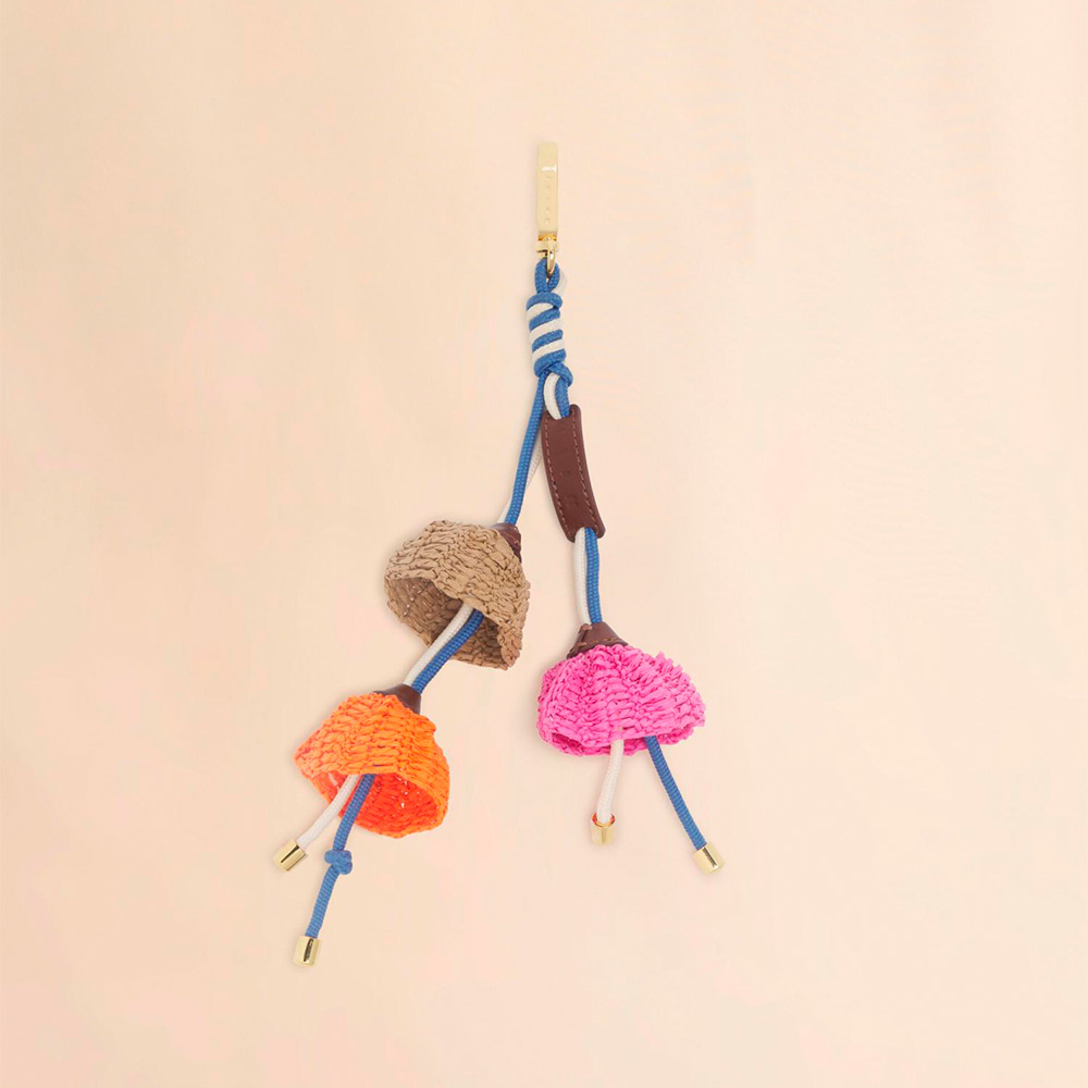 カラフルでエネルギッシュなムードを表現したフラワーチャーム。木製の型を用い、一本の糸で編み上げることで、立体的なフラワーフォルムを表現。フラワー部分にはペーパーストロー素材を使用し、中心にはコードを留めたメタルディテールを配している。手作業による仕上げのため、一点一点異なる表情がポイント。